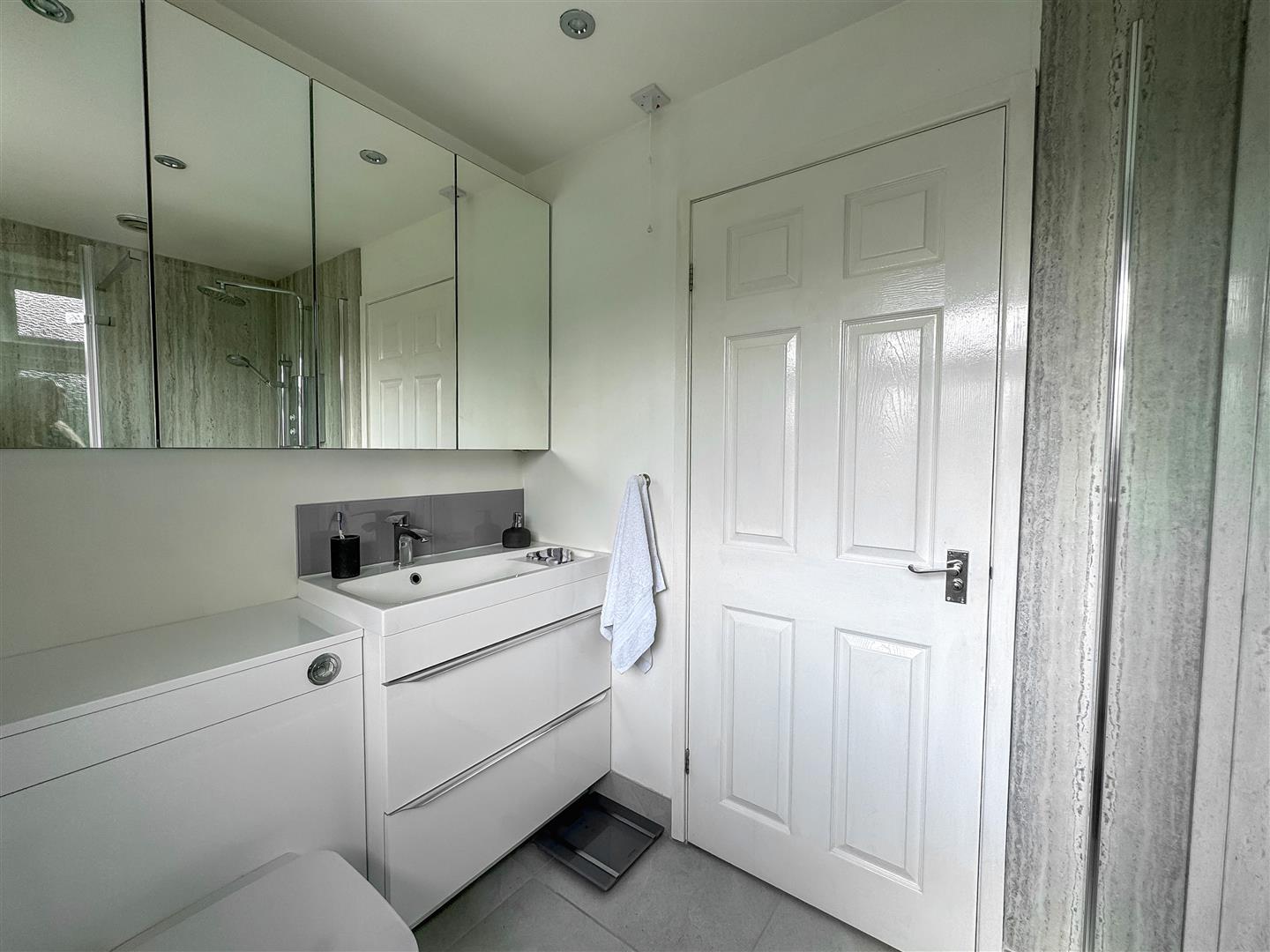 Family Bathroom - A well appointed bathroom fitted in white and including a panel sided bath with mains fed shower and fixed shower screen. Vanity wash basin with mixer tap and a concealed cistern toilet to the side, tiling for splashbacks, an anthracite towel radiator, electric shaver point, spotlights and extractor fan to the ceiling, tiled flooring and a uPVC double glazed obscured window to the rear aspect.