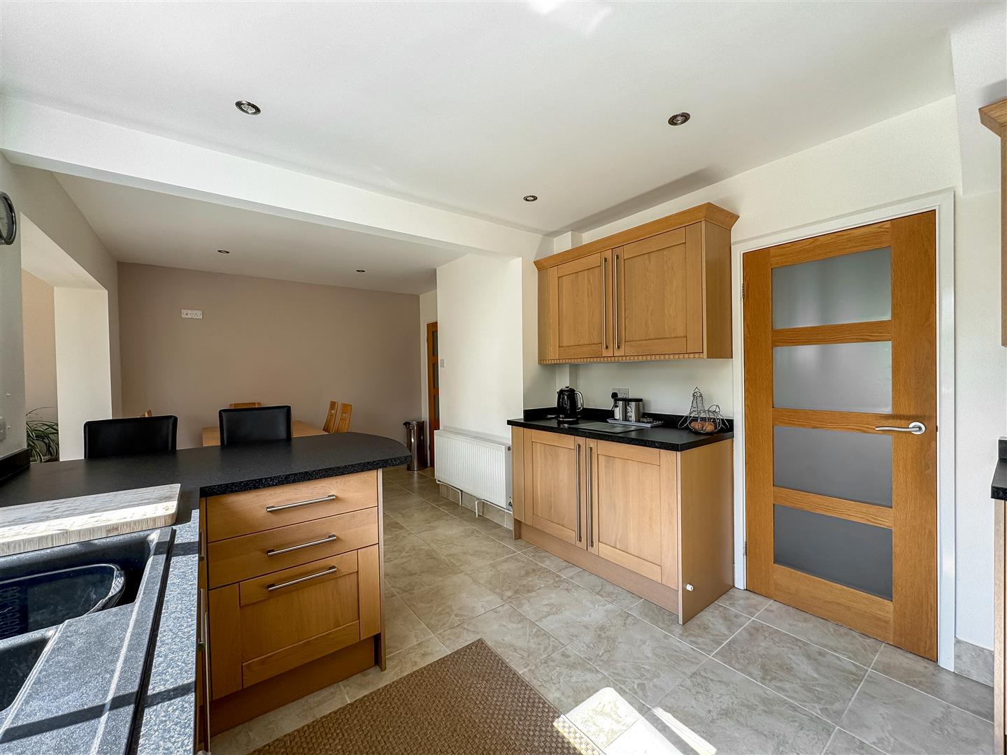 Dining Kitchen - A spacious and open plan dining kitchen with tiled flooring throughout, central heating radiator, spotlights to the ceiling, a uPVC double glazed window overlooking the rear garden, a door into the utility and access into the garden room. The kitchen is fitted with a range of solid oak fronted base and wall cabinets with linear edge granite effect rolled edge worktop and upstands, the worktop extending to a high level breakfast bar. Inset composite one and a half bowl single drainer sink with mixer tap and built-in appliances including a double oven by Bosch with four ring gas burner and concealed extractor hood over. There is an integrated fridge and freezer plus access into the garden room.