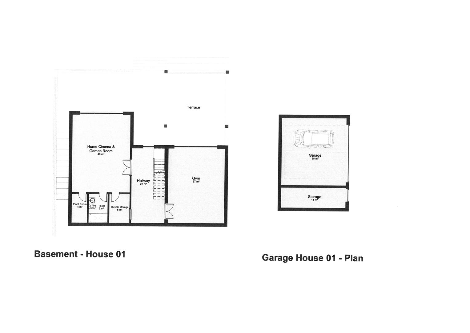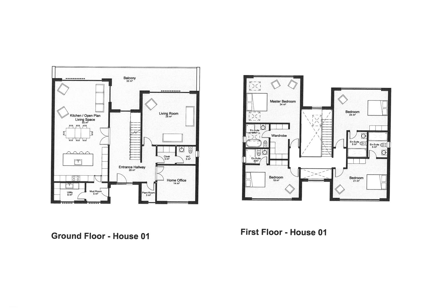 House 1 boasts 4,208 sq ft (391m2) arranged over three floors with a separate detached double garage with an adjoining store which provides a further 527 sq ft (49m2). The ground floor living accommodation comprises a stunning vaulted entrance hallway with double doors opening to a huge open plan living/dining/kitchen. There is a plant room, cloaks, WC, boot room, utility room, home office and a separate living room. There is a substantial 344 sq ft (32m2) balcony at ground floor level extending across the full width of the property overlooking the lower level terrace, rear garden and south facing open countryside beyond. The lower level ground floor provides a hallway, gym, home cinema/games room, bike store, plant room and a shower room. The lower ground floor configuration could be changed for alternative use such as additional bedroom or granny annex. The vaulted first floor galleried landing enjoys the best of the south facing views, together with lovely views over Coxmoor golf club to the north. There are four large bedroom suites each with vaulted ceilings and an en suite. The master bedroom has an en suite bathroom and a walk-in wardrobe.