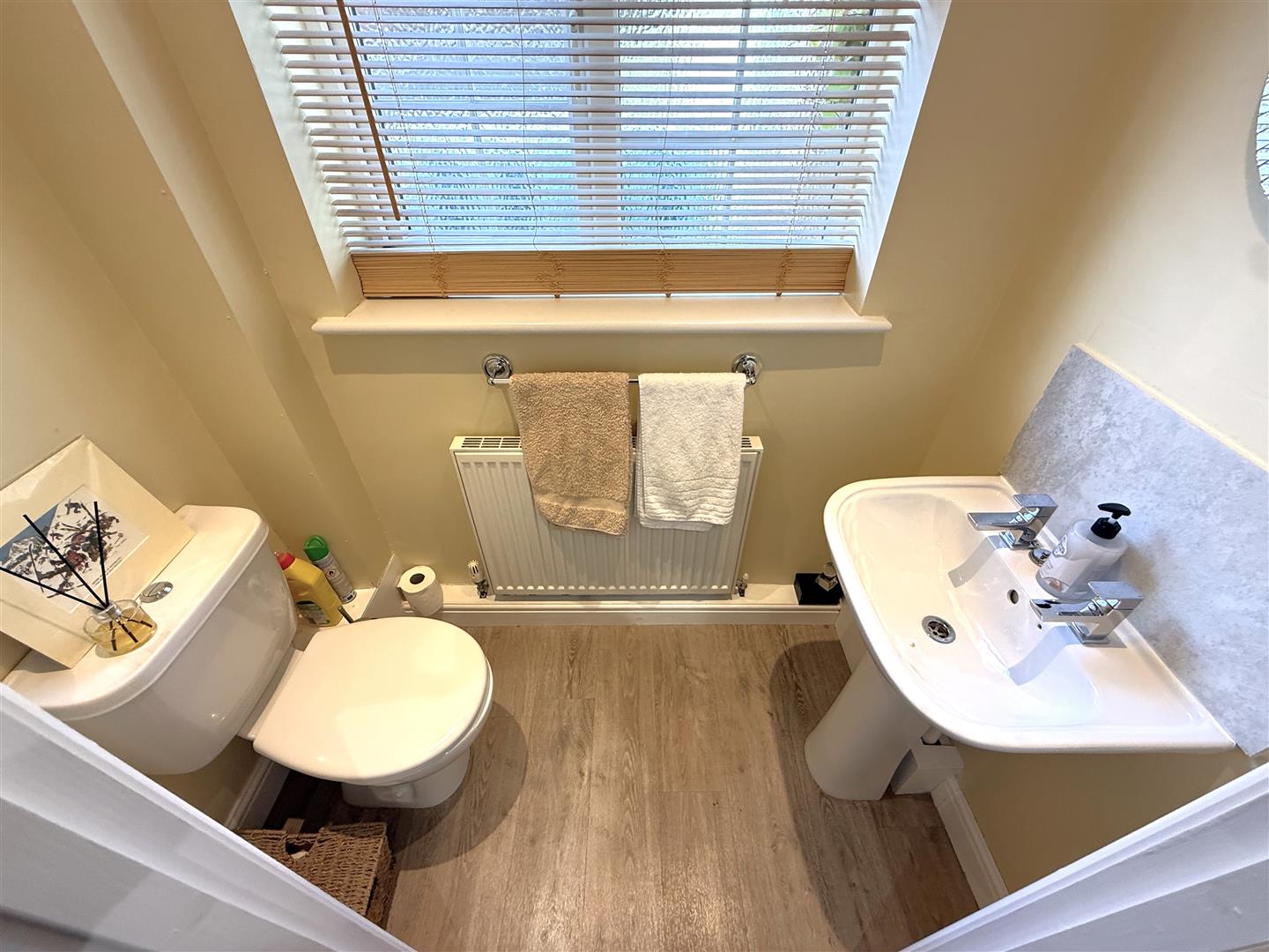 Ground Floor Cloak Room - 1.78m x 0.99m (5'10" x 3'3") - Having a two piece suite comprising close coupled WC and pedestal washbasin and double glazed window to the side.