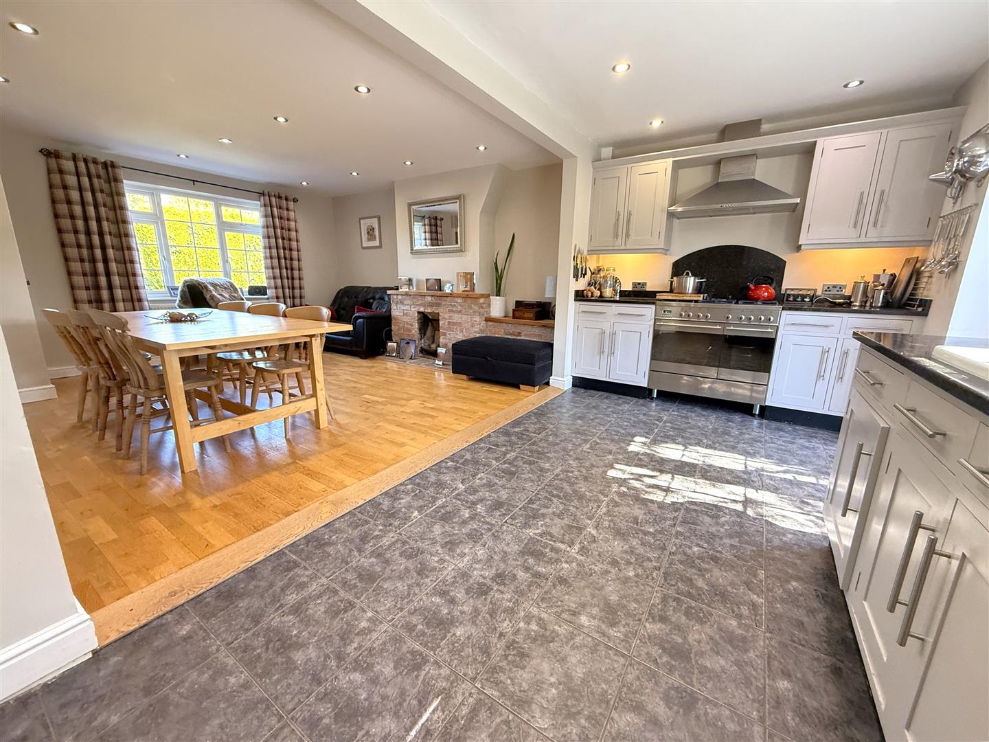 Open Plan L Shaped Living/Dining Kitchen - 6.96m max x 5.33m max (22'10" max x 17'6" max) - A fantastic, well proportioned, open plan space which provides both a living and dining area linking through into the kitchen which, combined, creates a light and airy dual aspect room with double glazed windows to the front and rear. The initial living/dining space having attractive exposed brick fireplace with flagstone hearth, alcoves to the side, continuation of the oak effect flooring, useful under stairs storage cupboard, contemporary column radiator and space for both living and dining. This area is, in turn, open plan to the kitchen which is fitted with a range of solid wood hand painted units with granite preparation surfaces, having ceramic sink and drain unit with brush metal mixer tap and granite upstands, integrated appliances including dishwasher and under counter fridge, space for free standing LPG gas range, double glazed windows and French doors into the garden. In addition there is a useful under stairs pantry which provides a good level of storage.