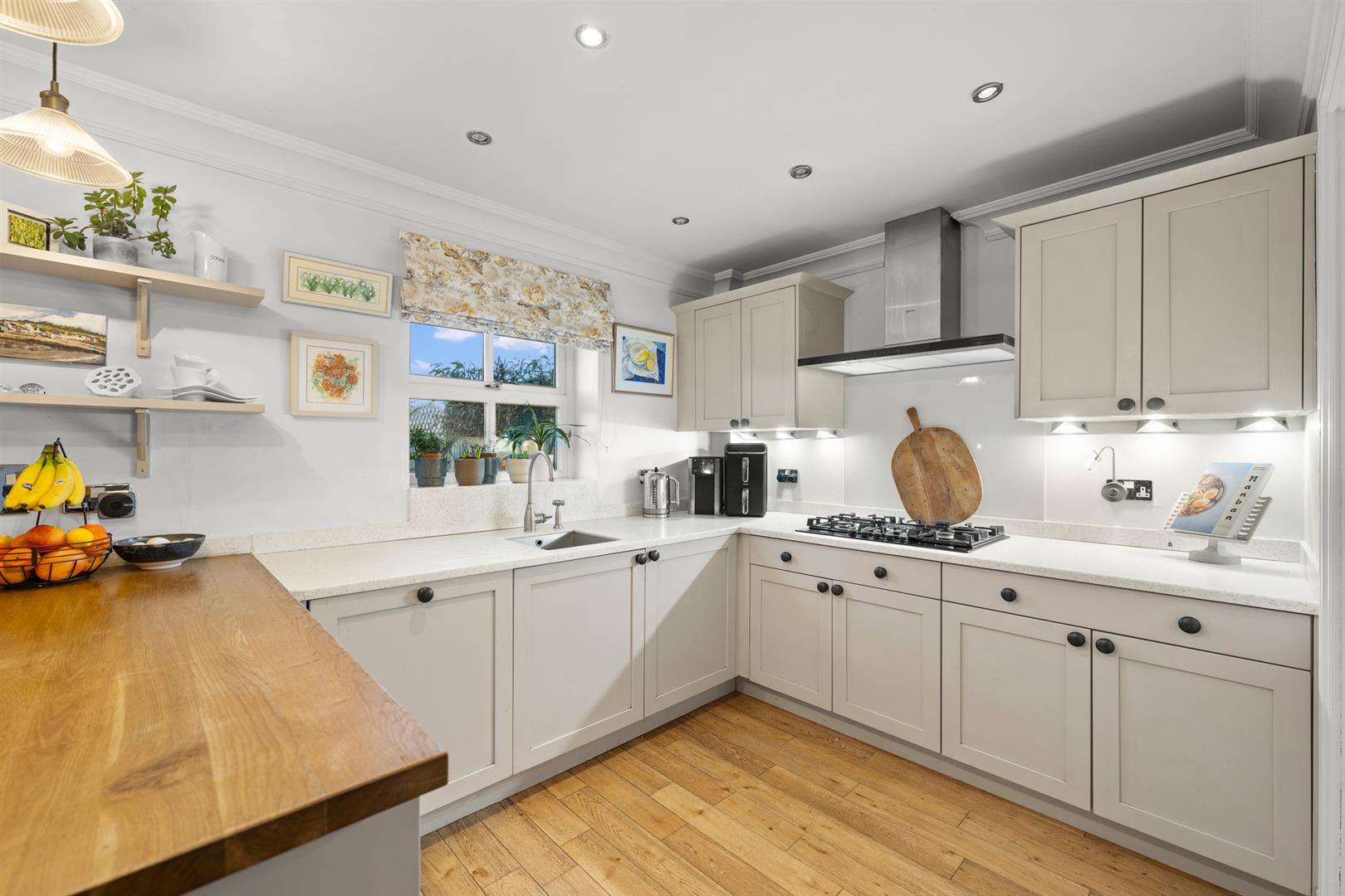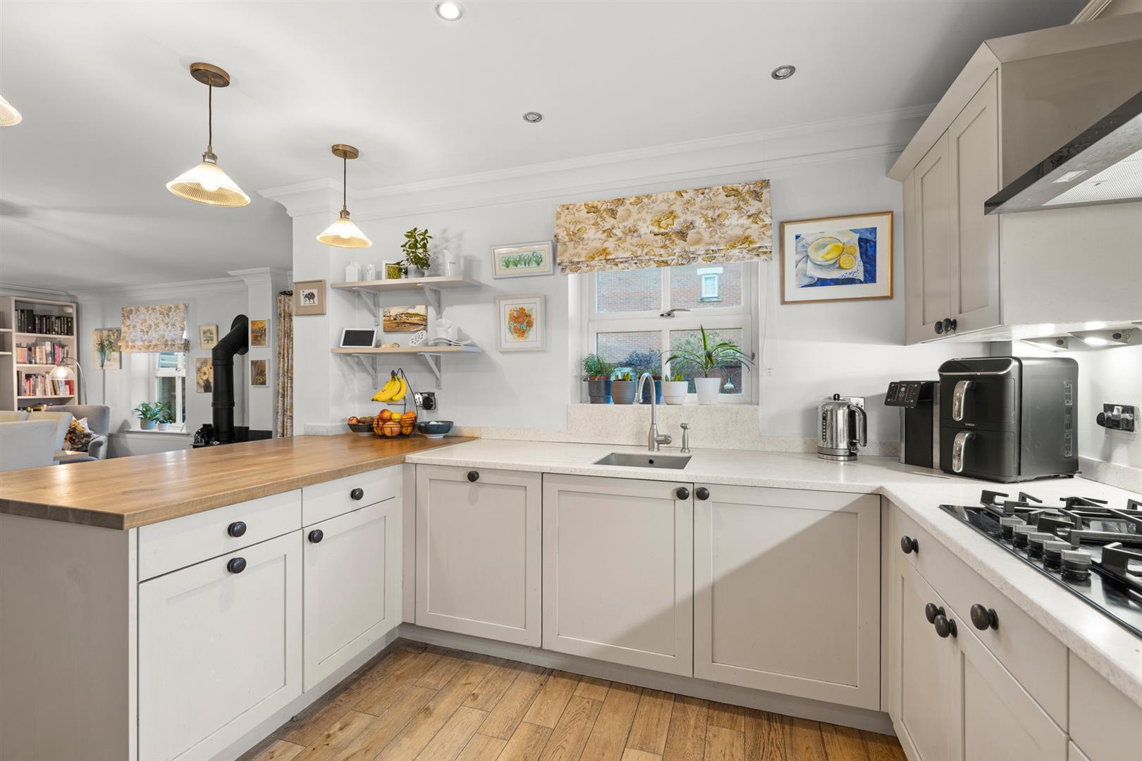 Kitchen - 3.71m x 3.20m max (12'2" x 10'6" max) - A tastefully appointed space fitted with a generous range of wall, base and drawer units finished in heritage style colours with a combination of both corian and oak preparation surfaces providing a good working area; undermounted stainless steel sink with brush metal swan neck mixer tap; integrated appliances including Neff five ring gas hob with chimney hood over, dishwasher, AEG double oven with microwave above, fridge and freezer; inset downlighters to a deep corniced ceiling, continuation of the engineered flooring and double glazed window overlooking the rear garden. In turn a further door leads to: