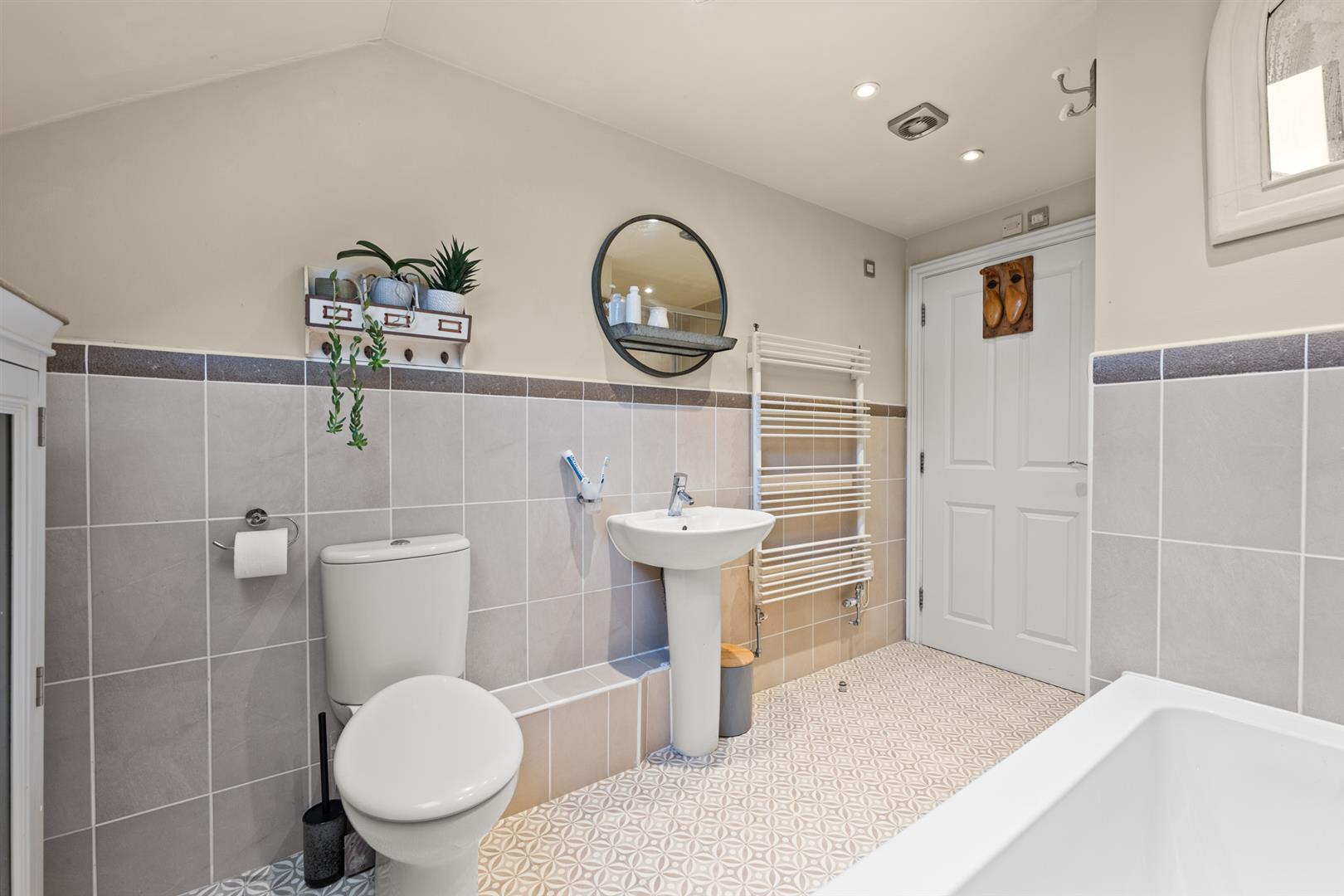 Main Bathroom - 3.56m x 2.13m (11'8" x 7') - A well proportioned space benefitting from a four piece suite comprising double width shower enclosure with sliding screen and wall mounted shower mixer, panelled double ended bath with wall mounted shower mixer and integral shower handset, close coupled WC and pedestal washbasin; contemporary towel radiator, tiled splash backs, part pitched ceiling with inset downlighters and skylight.