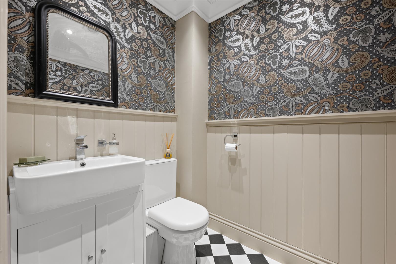 Ground Floor Cloak Room - 1.63m x 1.50m (5'4" x 4'11") - Having a two piece contemporary suite comprising close coupled WC and vanity unit with washbasin with chrome mixer tap, tongue and groove effect splash backs, corniced ceiling and inset downlighters.