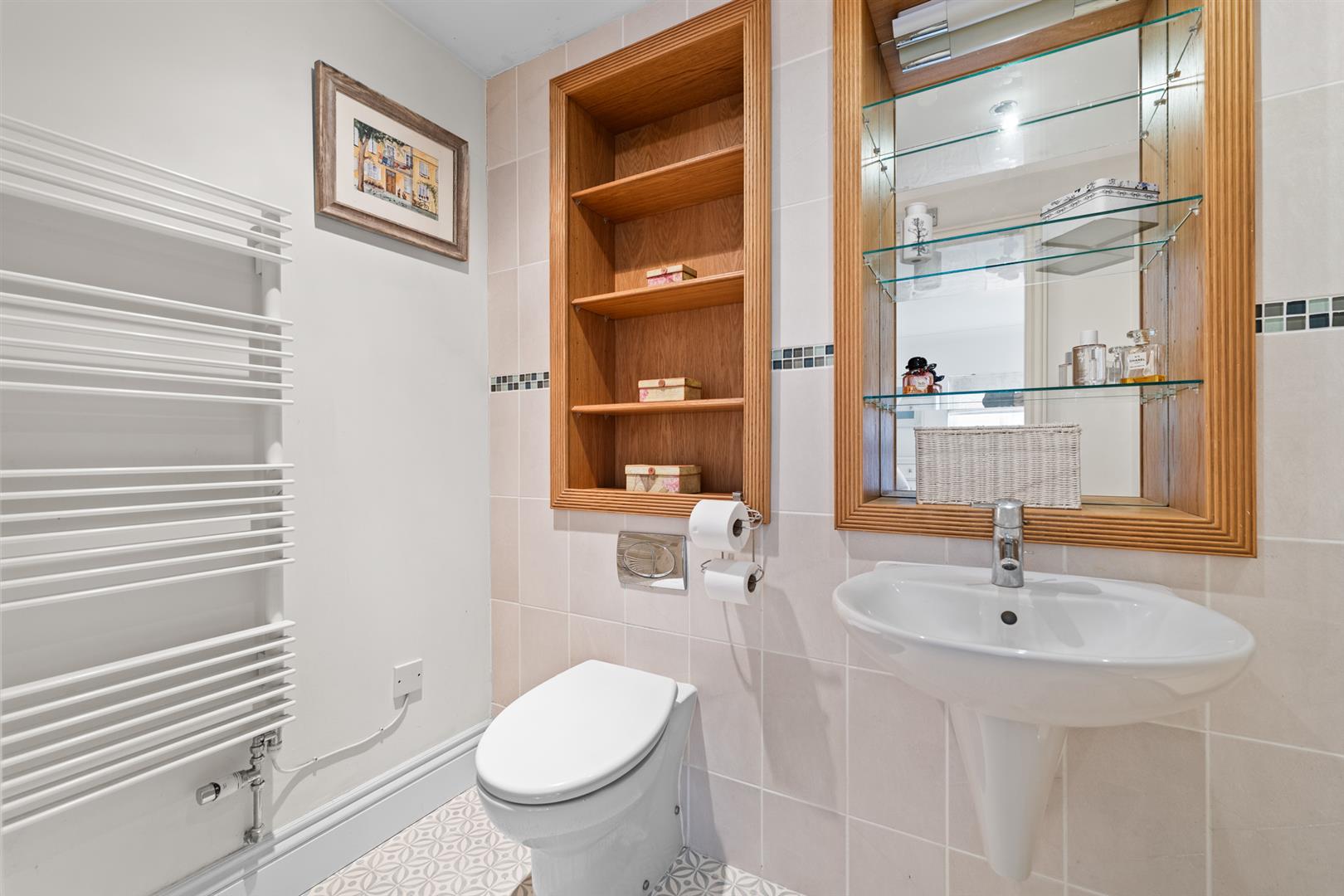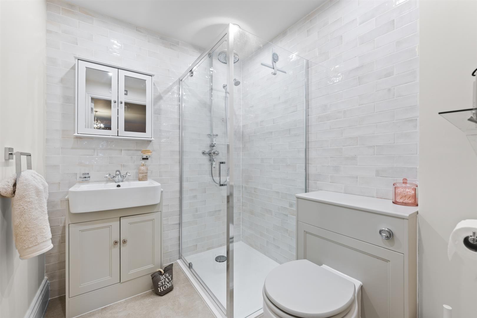 Ensuite Shower Room - 1.93m x 1.78m (6'4" x 5'10") - Tastefully appointed with a modern three piece suite with a heritage slant, comprising shower enclosure with glass screen and wall mounted shower mixer with both independent handset and rainwater rose over, close coupled WC set in a vanity surround and vanity unit with inset washbasin with chrome mixer tap and tiled splash backs; inset downlighters to the ceiling and contemporary towel radiator.