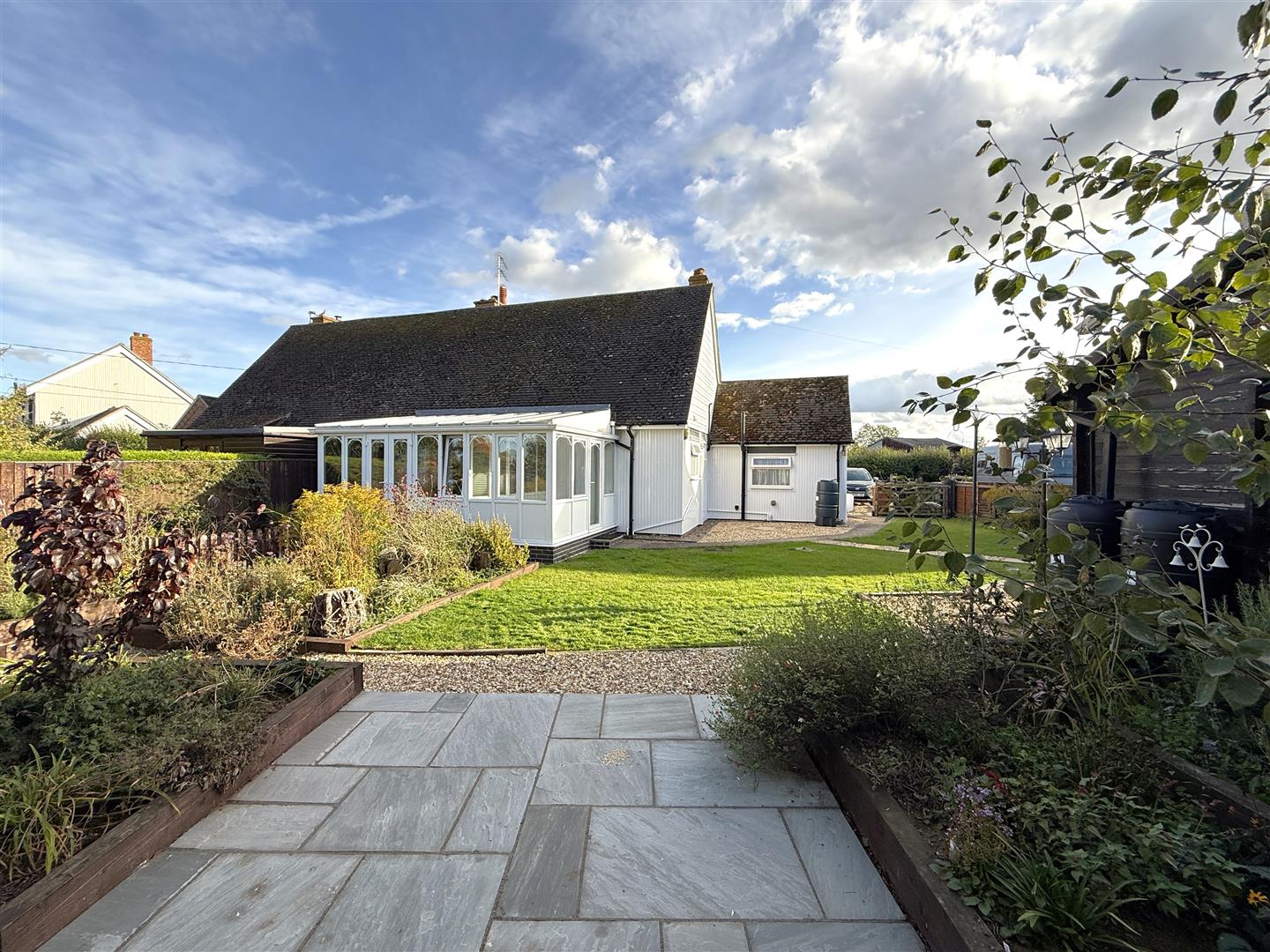 As well as the internal accommodation the property occupies a delightful plot which is generous by modern standards, set well back from the lane behind an established frontage with ample off road parking which, in turn, leads through into the rear garden. This is again an excellent outdoor space of good proportions, having a central lawn, well stocked perimeter borders, several seating areas providing different spaces to sit and relax, particularly in the summer months. Encompassed within the garden is both a useful timber storage shed and a substantial timber cabin which would make an excellent home office, home gym or simply a workshop/storage shed.