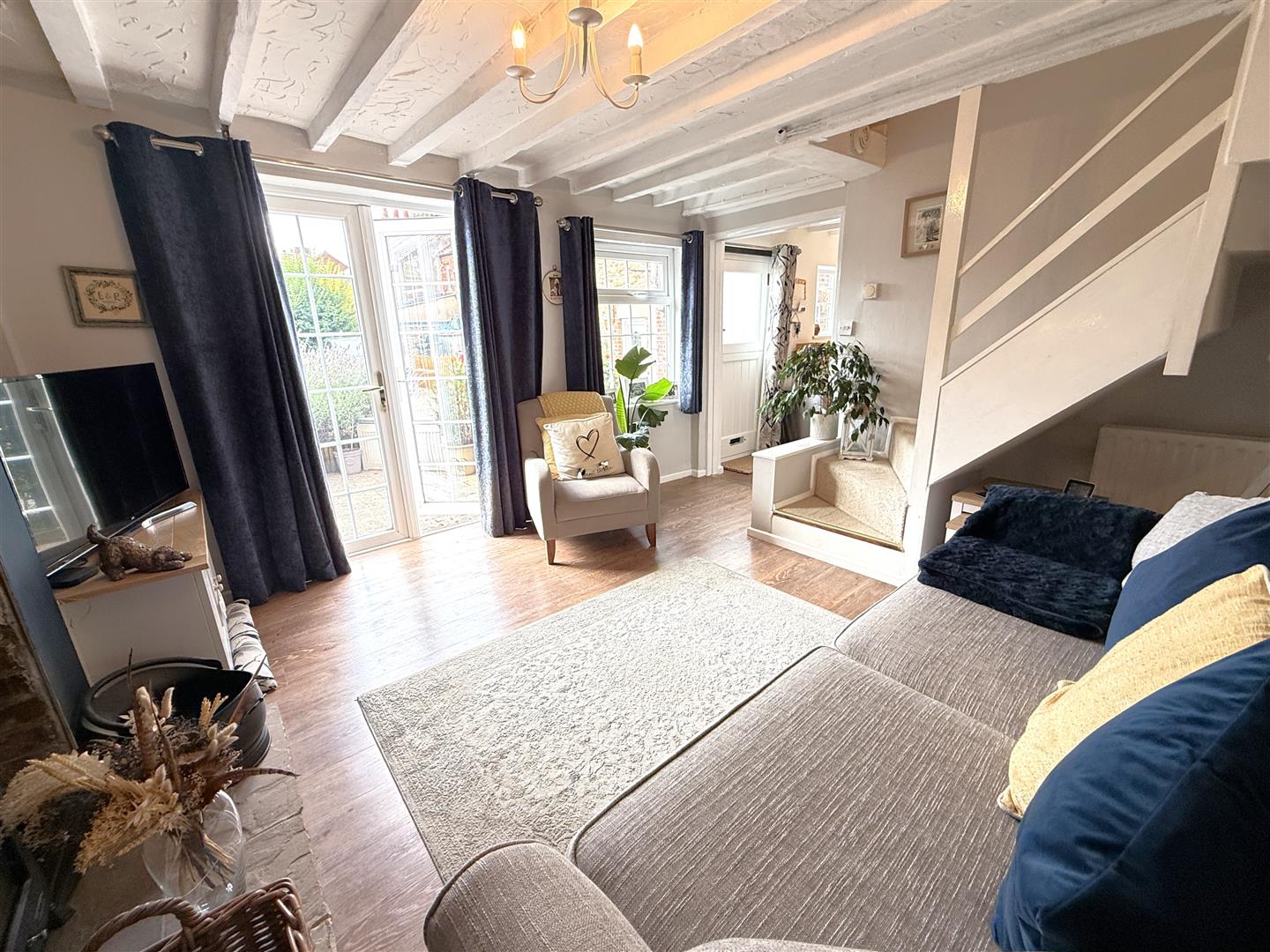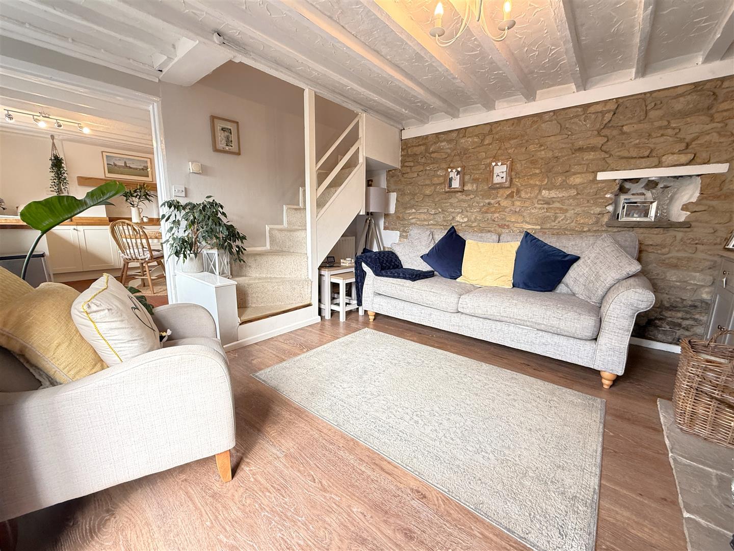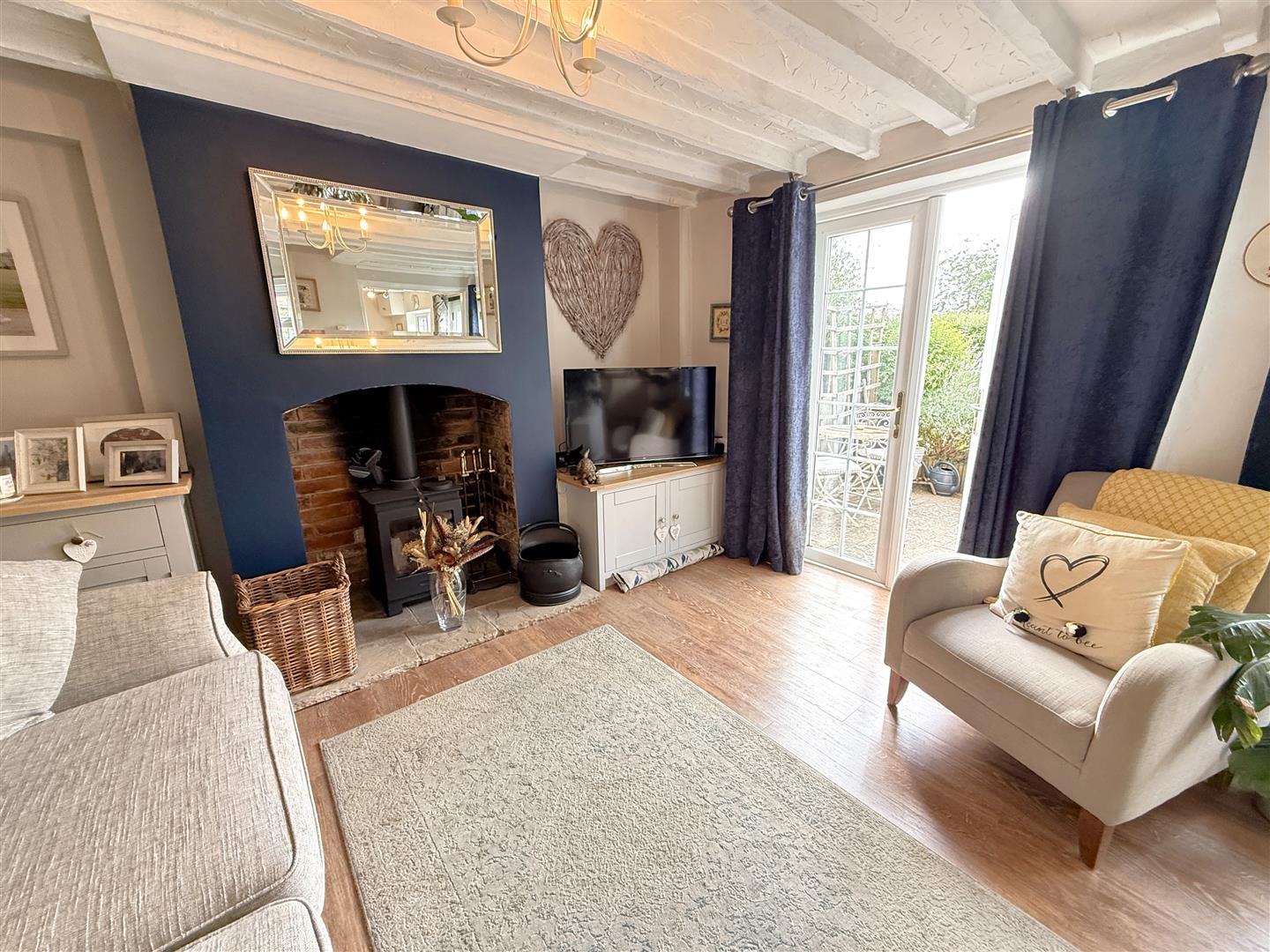 Sitting Room - 4.09m x 3.68m (13'5" x 12'1") - Again a beautiful room tastefully appointed with sympathetic decoration, having a wealth of character. The focal point to the room being a chimney breast with exposed brick back, flagged hearth and inset solid fuel stove. Alcoves to the side with bespoke built in low level storage cupboard, heavily beamed ceiling, wood effect laminate flooring, attractive exposed internal stone elevation, turning staircase rising to the first floor landing with alcove beneath, double glazed window and French doors leading out into the courtyard garden.