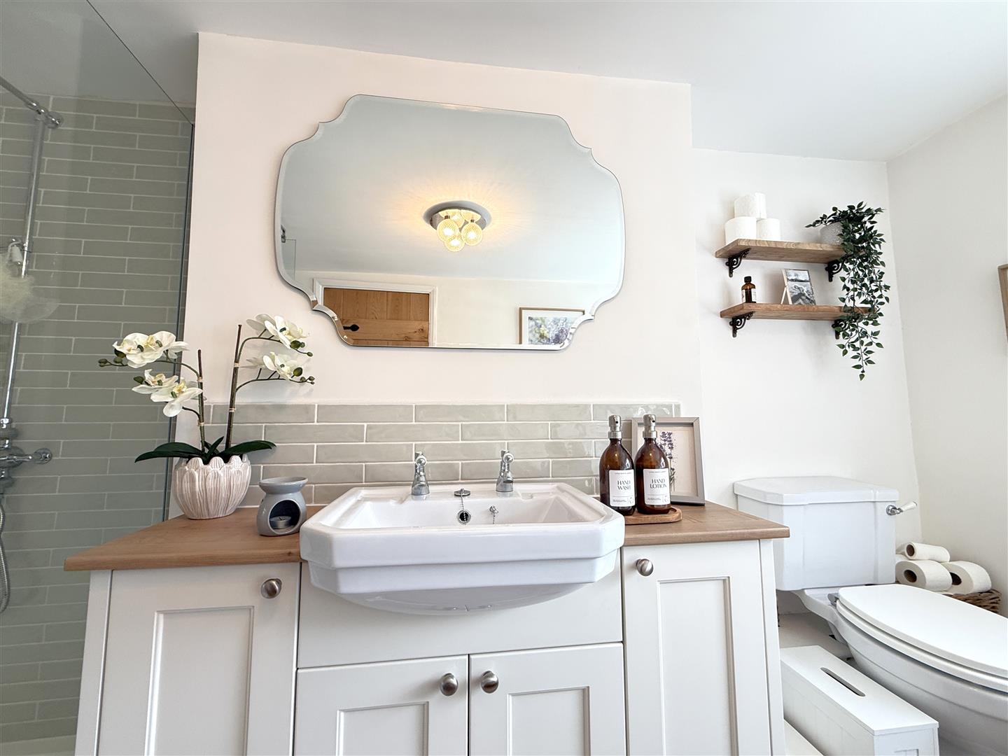 Bath/Shower Room - 3.61m x 2.34m (11'10" x 7'8") - Beautifully appointed with a modern suite with traditional elements, having attractive free standing ball and claw double ended roll top bath with chrome mixer tap and integral shower handset, separate double length shower enclosure with glass screen and wall mounted shower mixer with both independent handset and rainwater rose over, close coupled WC and vanity unit with inset Holborn traditional style sink with chrome taps and tiled splash backs, oak effect flooring, deep skirtings, combination column towel radiator and double glazed window to the front.