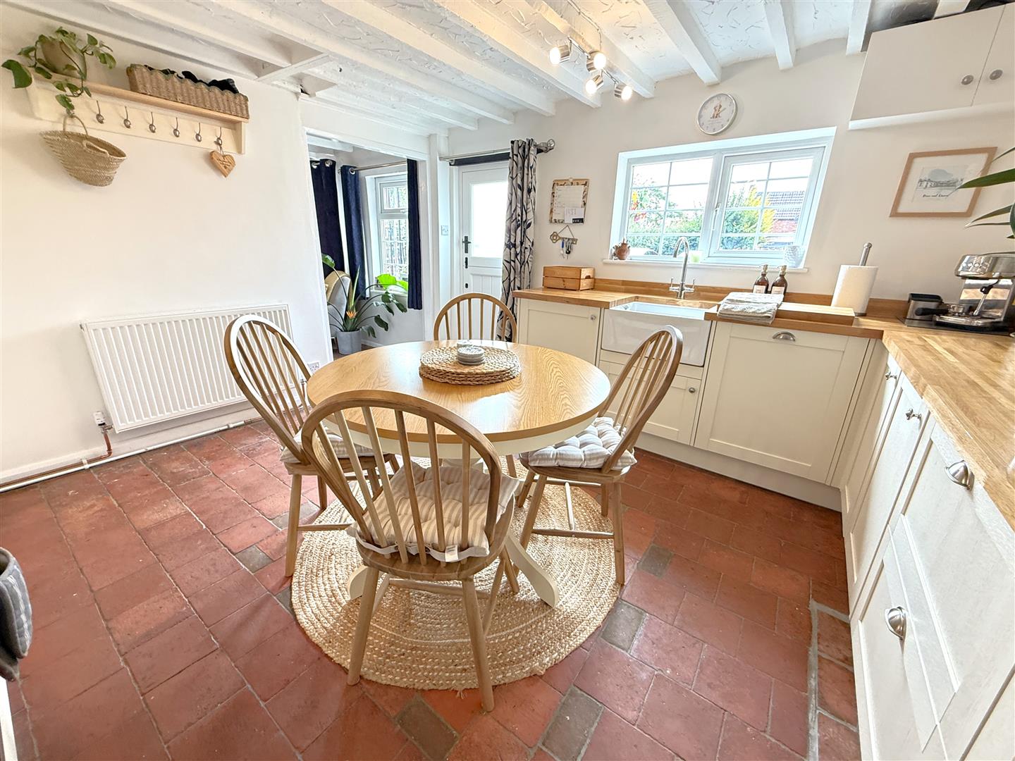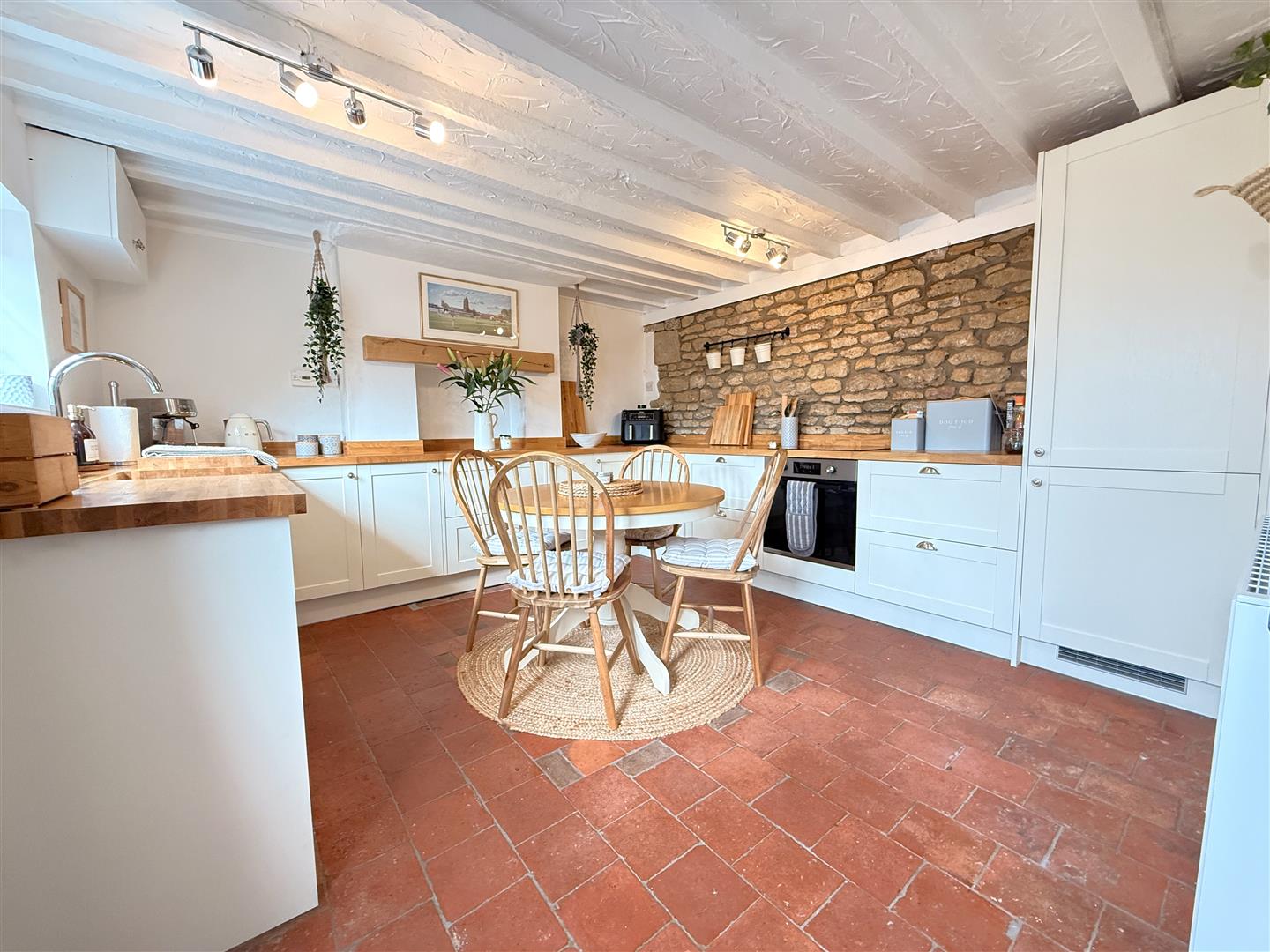 Initial Dining Kitchen - 3.96m x 3.66m (13' x 12') - A delightful light and airy room offering a wealth of character and features, having exposed internal stonework, attractive heavily beamed ceiling, quarry tiled floor and double glazed window to the front. The kitchen is beautifully appointed having been sympathetically modernised with a range of cream fronted Shaker style base units with cottage style fittings and oak preparation surfaces providing an excellent working area, having undermounted Belfast style sink with chrome swan neck mixer tap and oak upstands, integrated appliances including Lamona induction with fan assisted oven beneath, fridge, freezer, dishwasher and washing machine, wall mounted electrical consumer unit consumed behind cupboard and an open doorway leading through into: