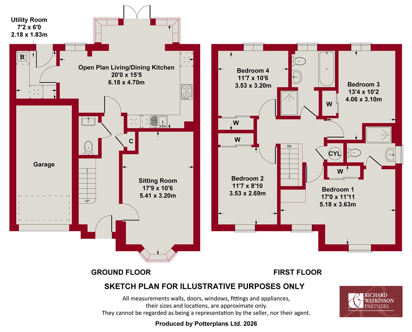 The property offers a well thought out design, benefitting from four double bedrooms including a particularly spacious principle room with an initial walk through dressing area and ensuite facilities and separate family bath/shower room. The ground floor layout again works exceptionally well, having a pleasant sitting room with walk in bay window to the front and a generous open plan living/dining kitchen which is flooded with light having a large walk in bay window to the rear as well as a westerly aspect. In addition there is a useful utility and a ground floor cloak room leading off the initial hallway.