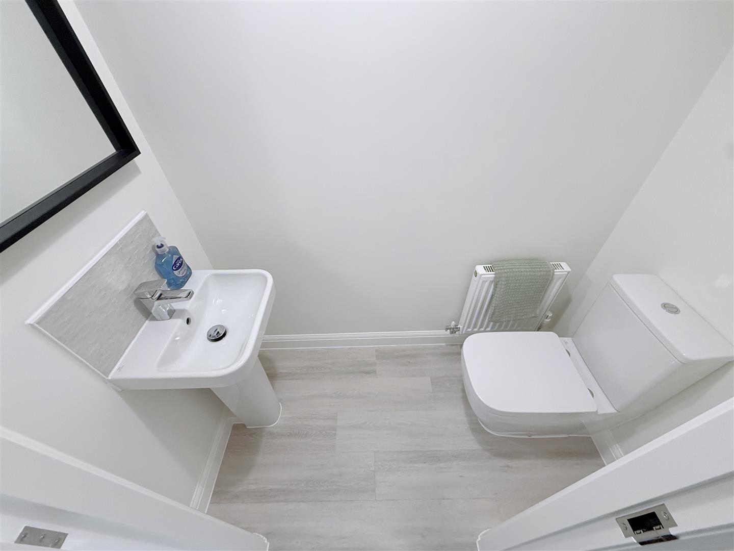 Ground Floor Cloak Room - 1.78m x 0.89m (5'10" x 2'11") - Having a contemporary two piece white suite comprising close coupled WC and pedestal washbasin with chrome mixer tap and tiled splash backs and central heating radiator.