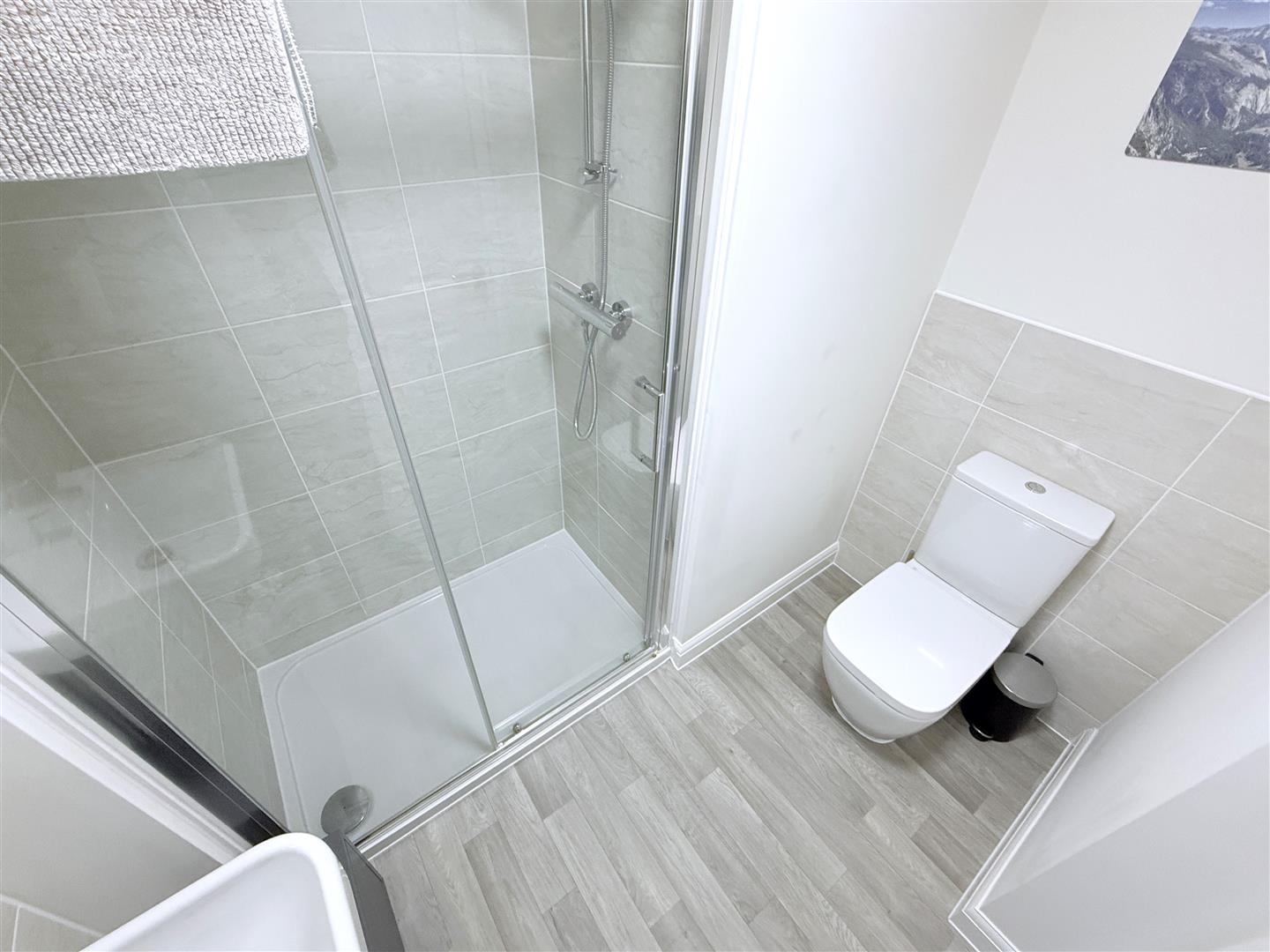 Ensuite Shower Room - 2.21m x 1.91m (7'3" x 6'3") - Having a contemporary suite comprising double width shower enclosure with glass screen and wall mounted shower mixer with independent handset over, close coupled WC and pedestal washbasin with chrome mixer tap and tiled splash backs and contemporary towel radiator.