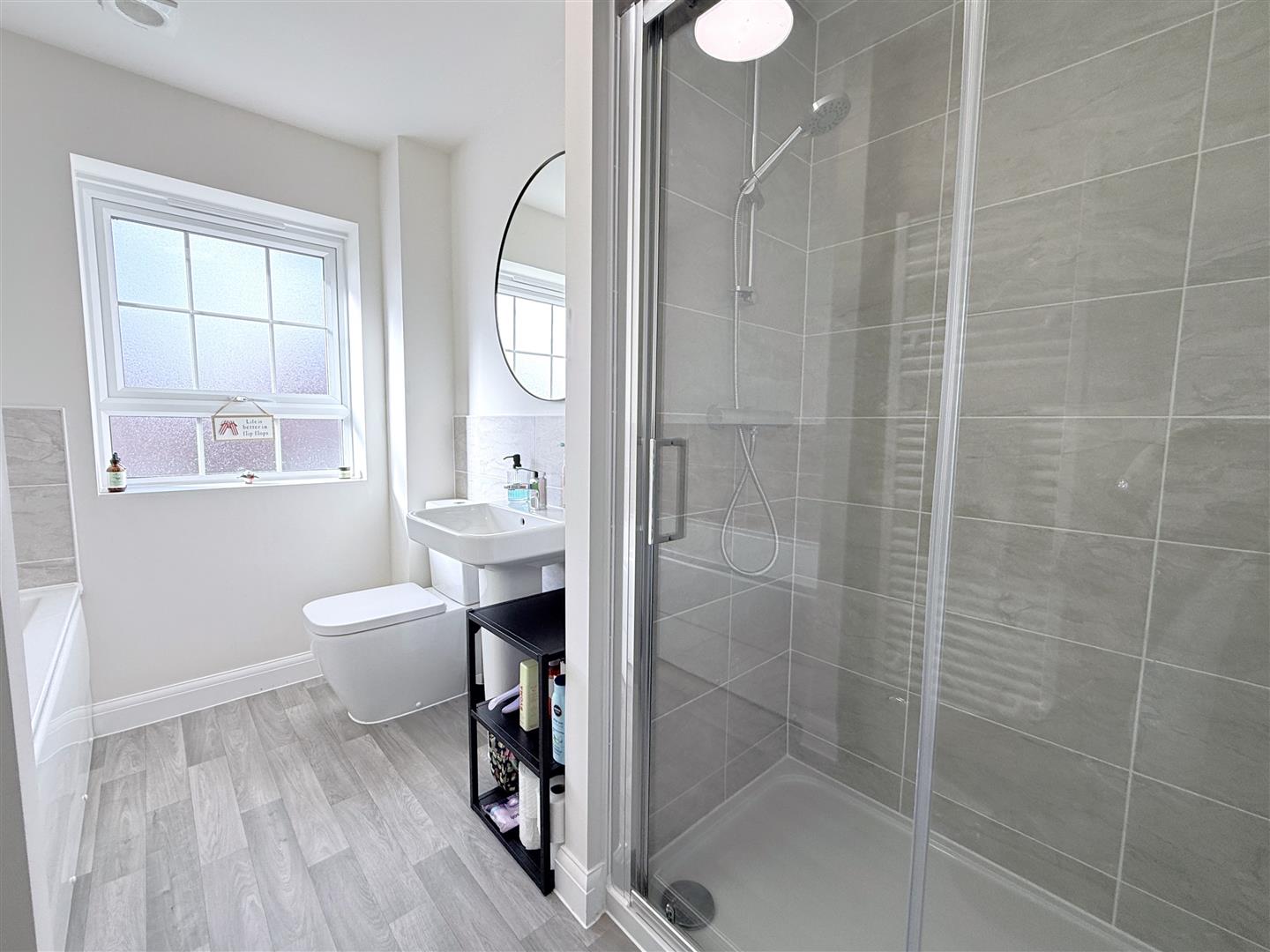 Family Bath/Shower Room - 2.97m x 1.98m (9'9" x 6'6") - Having a contemporary four piece suite comprising double width shower enclosure with sliding glass screen and wall mounted shower mixer, panelled bath with chrome mixer tap and tiled splash backs, pedestal washbasin with chrome mixer tap and close coupled WC; contemporary towel radiator and double glazed window to the rear.