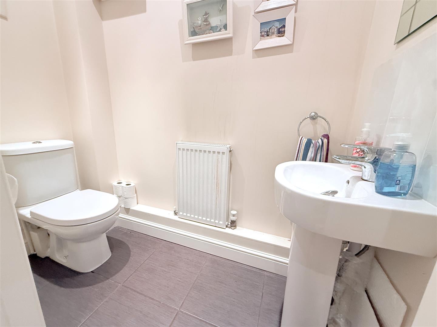 Ground Floor Cloak Room - 2.01m x 0.97m (6'7" x 3'2") - Having a two piece white suite comprising close coupled WC and pedestal washbasin with chrome mixer tap and tiled splash backs,