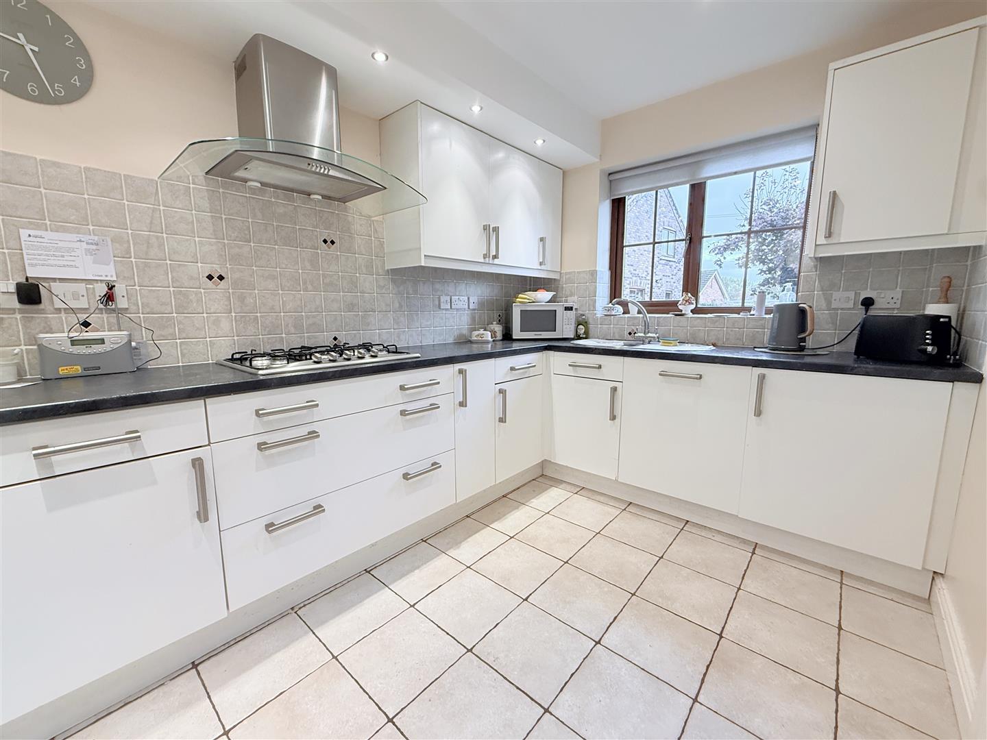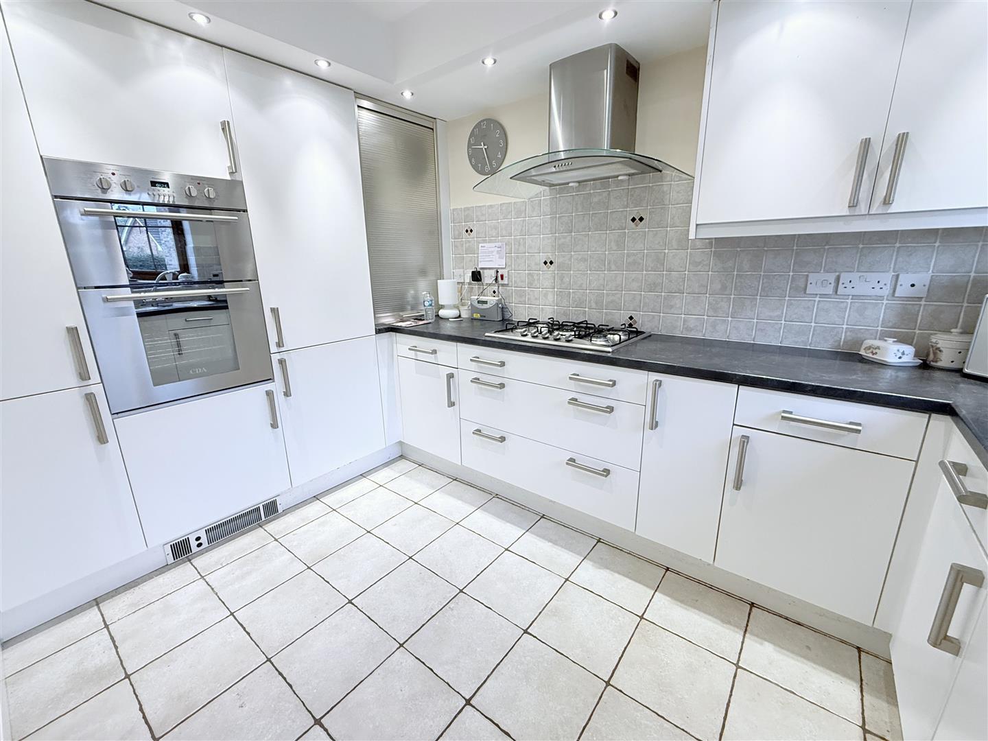 Kitchen - 3.35m max x 2.34m (11' max x 7'8") - Tastefully appointed having a generous range of contemporary white gloss fronted wall, base and drawer units with brush metal fittings, having an L shaped configuration of laminate preparation surfaces, inset round bowl stainless steel sink and drain unit with chrome mixer tap and tiled splash backs, integrated appliances including five ring gas hob with chimney hood over, dishwasher, fridge, freezer and CDA double oven set in a useful larger surround that provides further storage. In addition there are inset downlighters to the ceiling and double glazed window to the front.