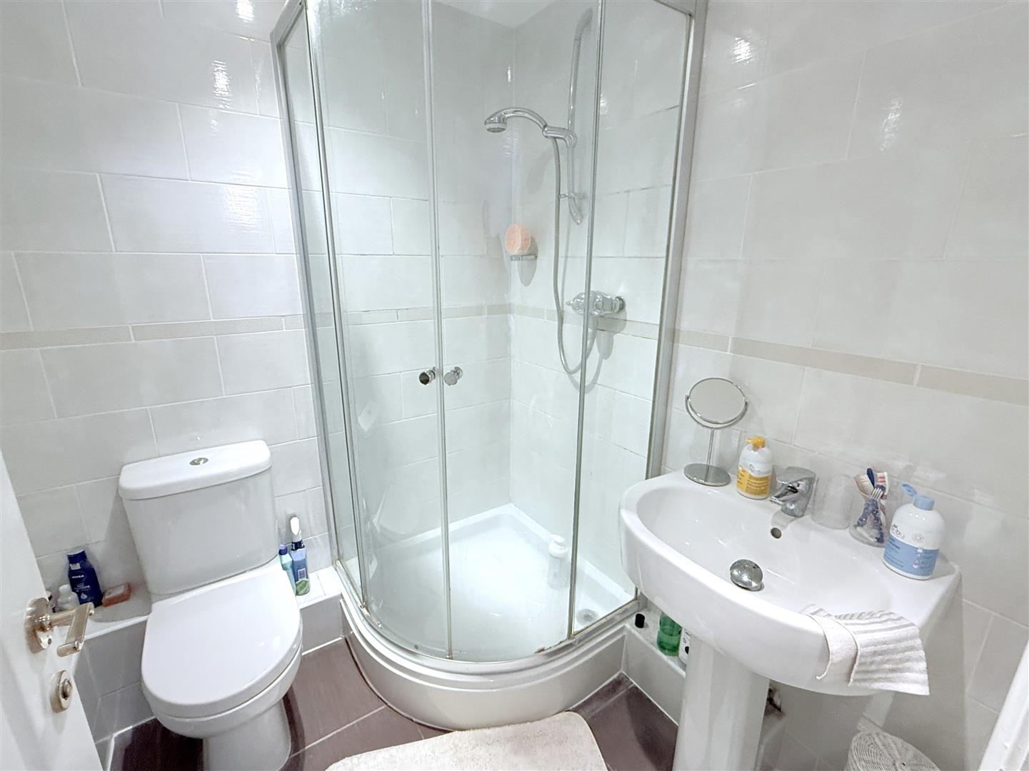 Ensuite Shower Room - 1.75m x 1.78m (5'9" x 5'10") - Having a three piece white suite comprising quadrant shower enclosure with double doors and wall mounted shower mixer, close coupled WC and pedestal washbasin, contemporary towel radiator and tiled walls.