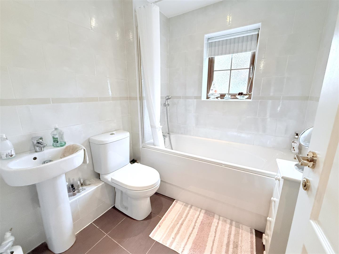 Bathroom - 1.83m x 2.06m (6' x 6'9") - Having a three piece suite comprising panelled bath with chrome mixer tap with integral shower handset, close coupled WC and pedestal washbasin with chrome mixer tap, fully tiled walls, contemporary towel radiator and double glazed window to the rear.