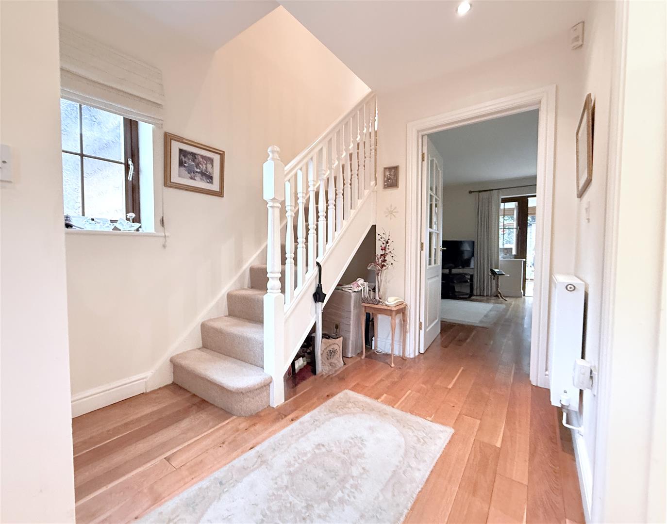 Main L Shaped Entrance Hall - 3.51m max x 2.26m max (11'6" max x 7'5" max) - A pleasant initial entrance vestibule having attractive stripped wood oak flooring, spindle balustrade staircase rising to the first floor with useful under stairs storage beneath, double glazed window to the side and further doors leading to: