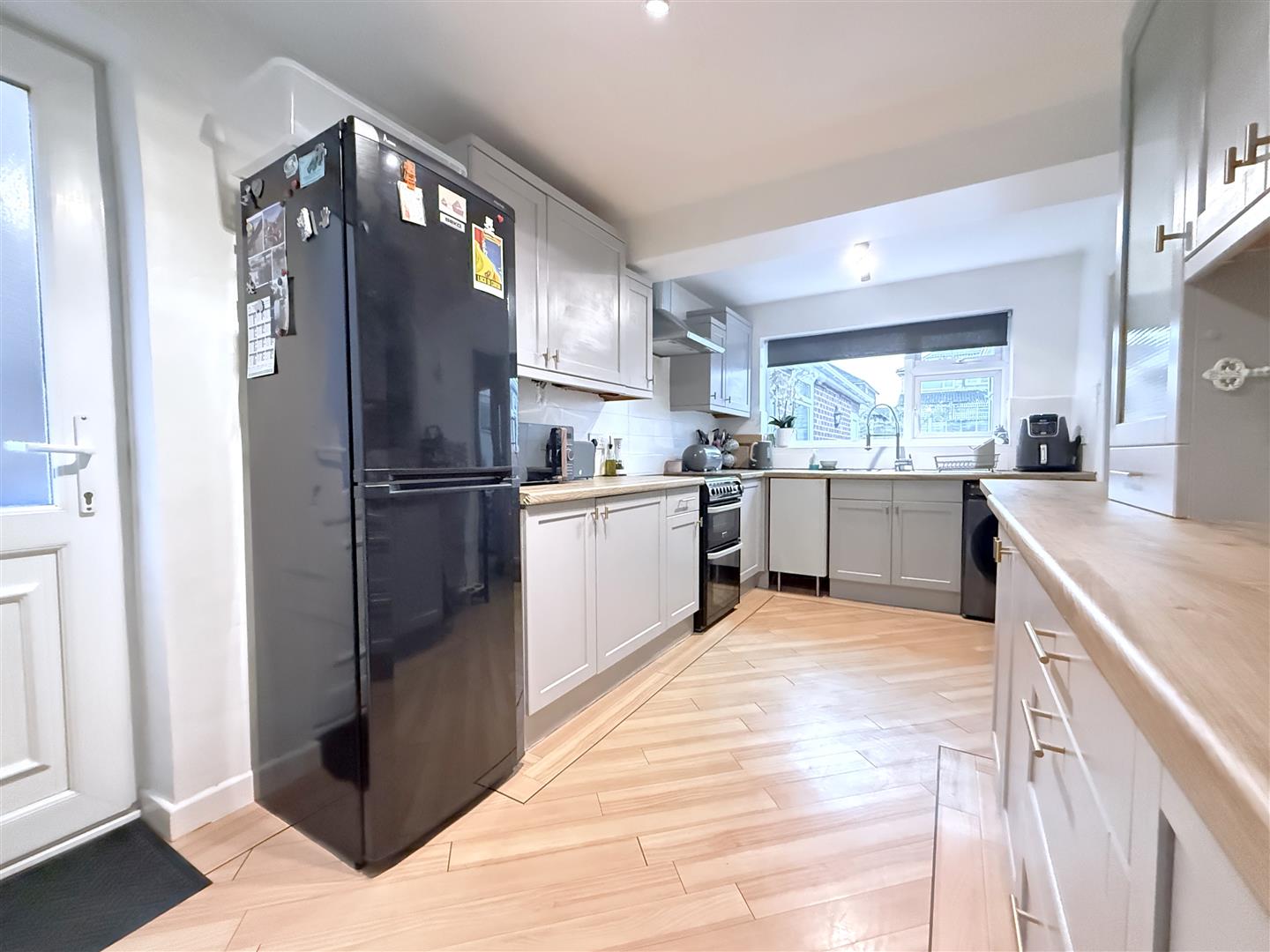 Kitchen - 4.78m x 2.49m (15'8" x 8'2") - A further part glazed internal door leads through into the kitchen which is fitted with a generous range of wall, base and drawer units including glazed display cabinets and having two runs of laminate preparation surfaces providing a good working area, one with inset stainless steel sink and drain unit with chrome swan neck articulated mixer tap; space for freestanding fridge freezer and cooker; plumbing for washing machine; double glazed window to the rear, exterior door to the side and further glazed internal door leading through into: