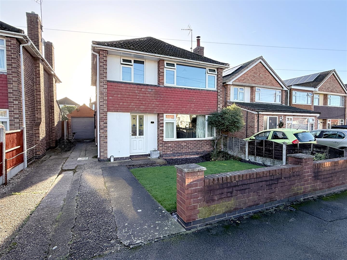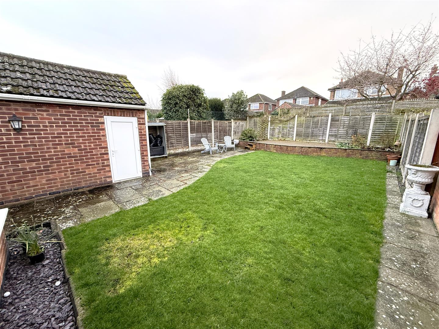 Exterior - The property occupies a level plot set back behind a low brick walled frontage with a lawned area and adjacent driveway that provides off road car standing and continues to the rear of the property where there is a detached brick built garage. A courtesy gate leads into a southerly facing rear garden with an initial paved terrace that sweeps down to a further seating area with raised deck at the foot. The remainder of the garden is laid to lawn and is enclosed in the main by panelled fencing and brick walls.