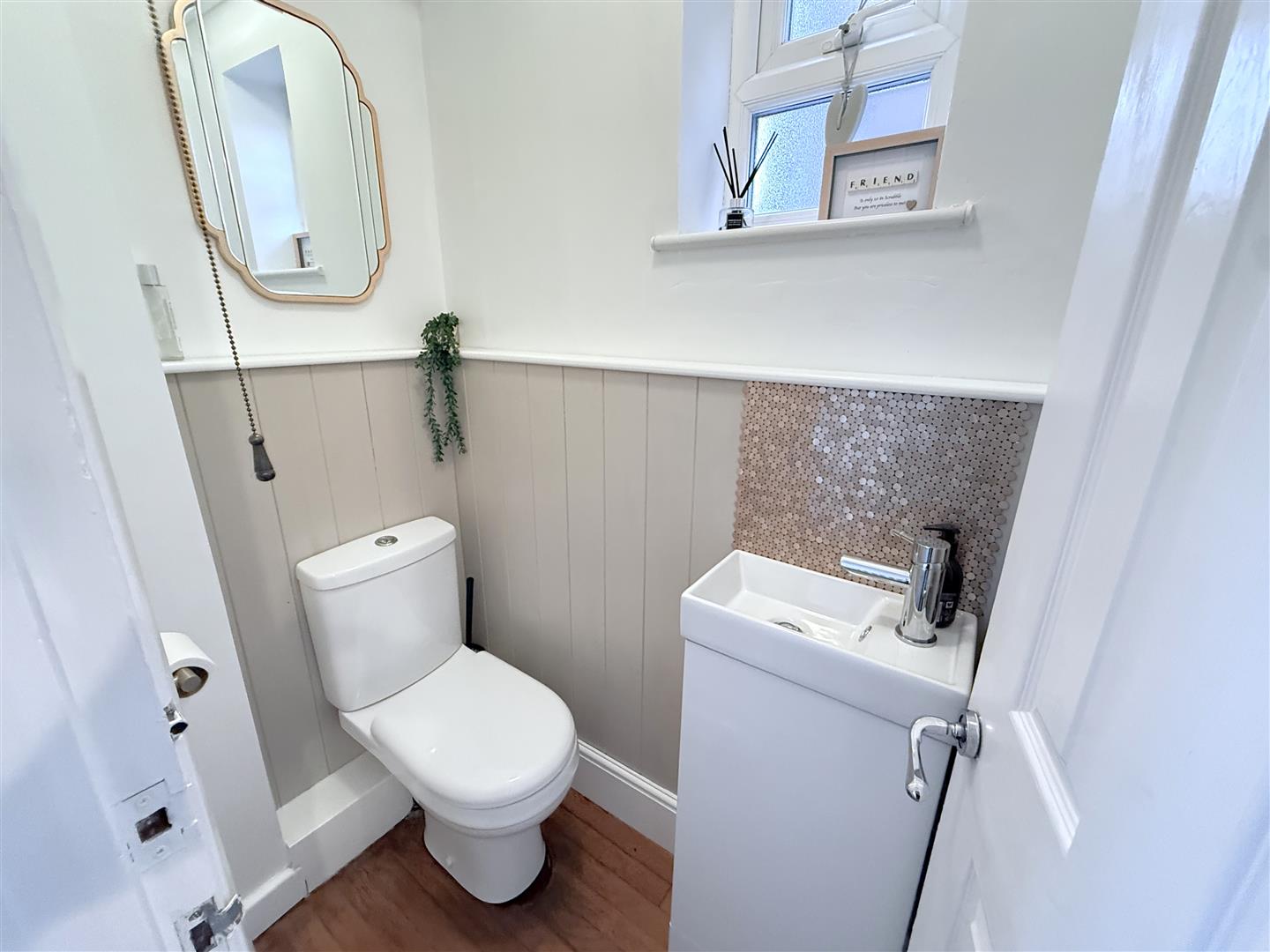 Ground Floor Cloak Room - 1.50m x 0.86m (4'11" x 2'10" ) - Having a two piece contemporary white suite comprising close coupled WC and rectangular washbasin with chrome mixer tap, tongue and groove effect splash backs, continuation of the stripped wood flooring and double glazed window to the side.