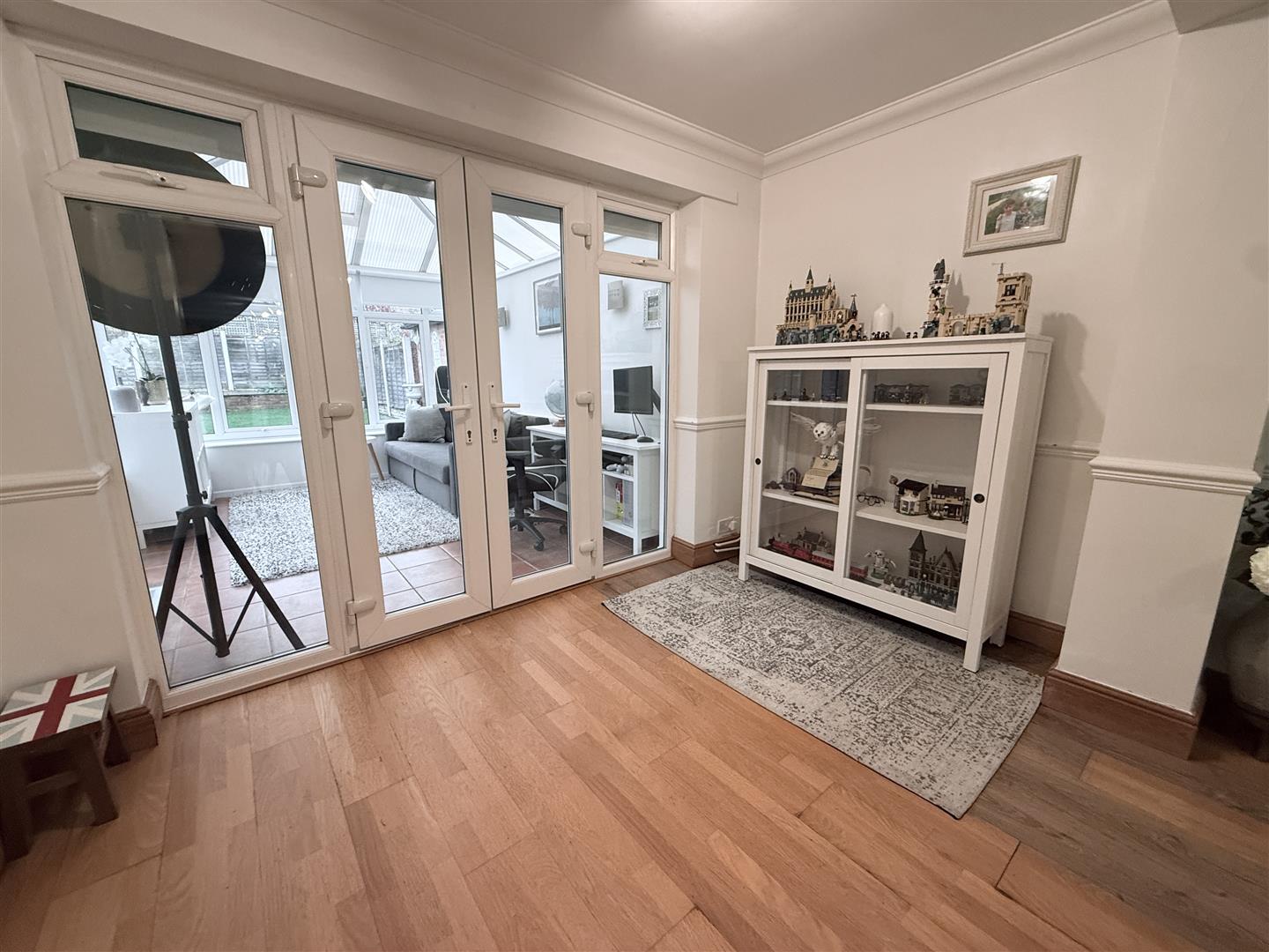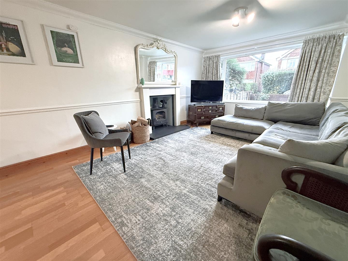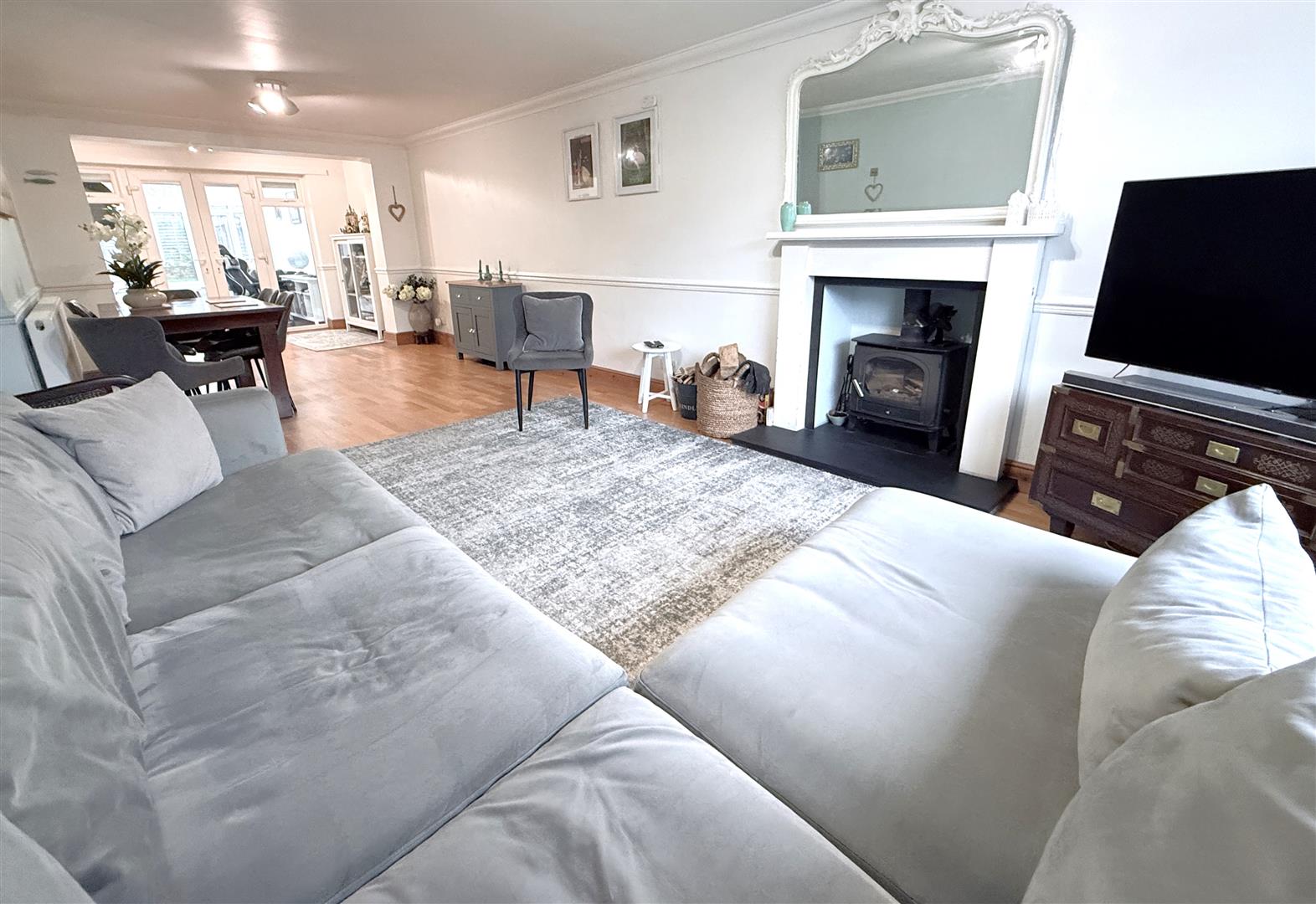 Open Plan L Shaped Living/Dining Room - 9.75m in total x 3.84m (32' in total x 12'7") - A fantastic well proportioned open plan reception which is large enough to accommodate both a living and dining area as well as linking through into the useful addition of a conservatory at the rear. The main sitting room offers the attractive feature of a fireplace with timber fire surround, mantel and slate hearth with inset solid fuel stove. In addition the room having deep coved ceiling, dado rail, wood effect laminate flooring, pine skirting, large double glazed picture window to the front and double glazed French doors leading through into: