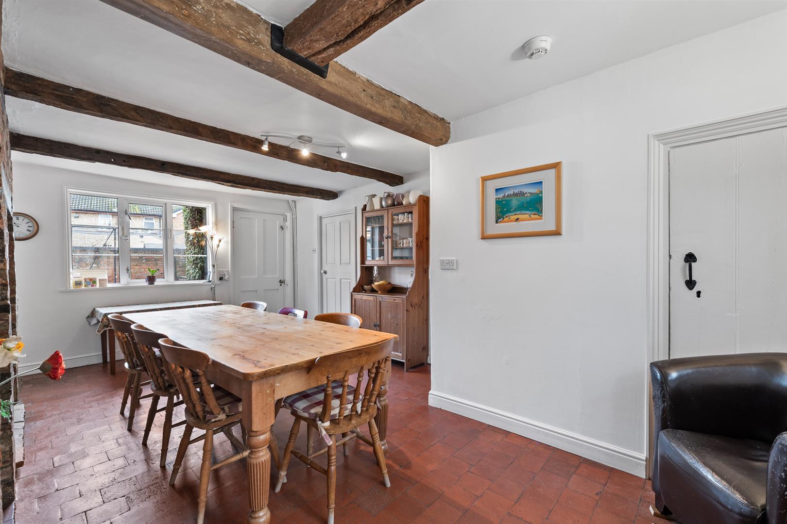 Dining Room - 6.10m x 3.66m (20' x 12') - A versatile reception ideal as formal dining lying adjacent to the kitchen, having an attractive beamed ceiling, exposed brick chimney breast with inset timbers, quarry tiled floor, double glazed windows to two elevations, exterior door into the rear garden, a door giving access to a secondary staircase rising to the second floor, a further door giving access to steps descending down into :-