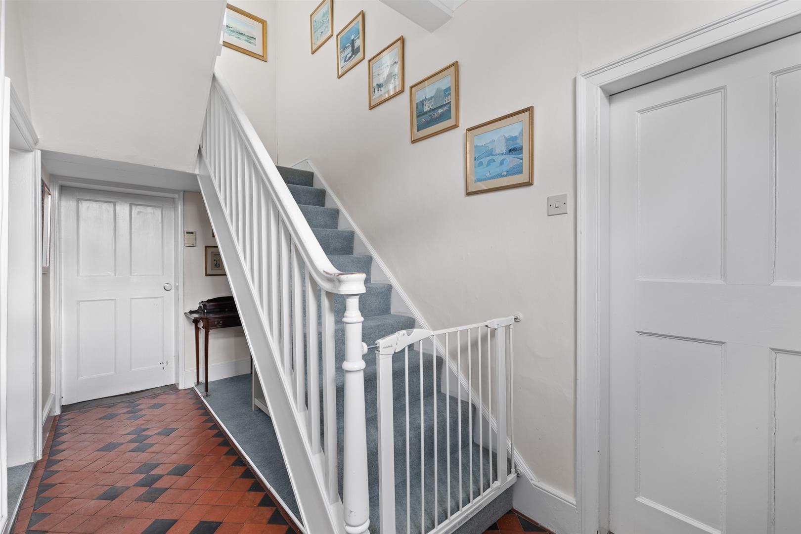 Initial Entrance Hall - 4.27m x 1.83m (14' x 6') - A pleasant initial entrance vestibule having a spindle balustrade staircase rising to the first floor, attractive quarry tiled floor, initial inset bristle mat, deep skirtings and architraves, coved ceiling and further doors leading to: