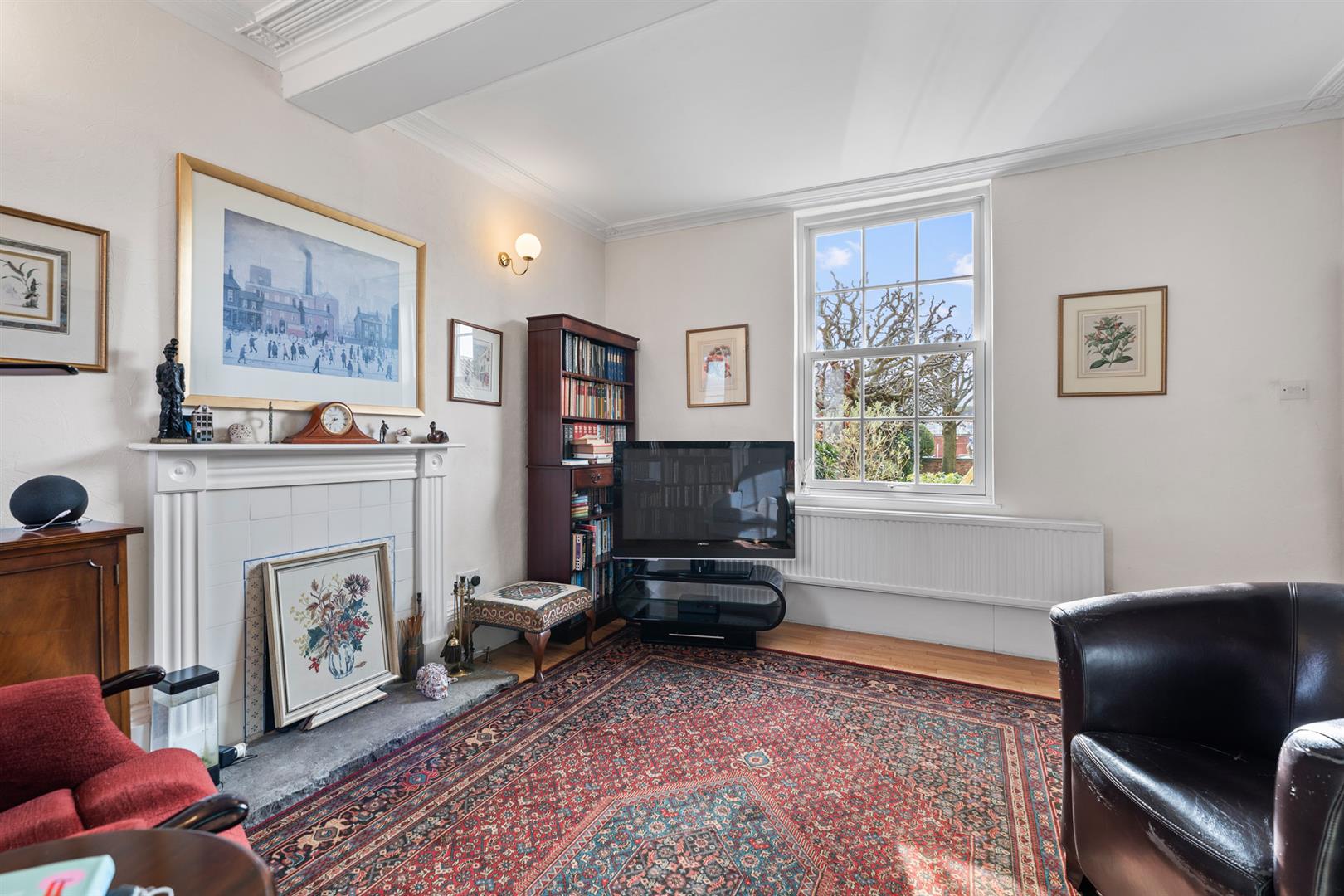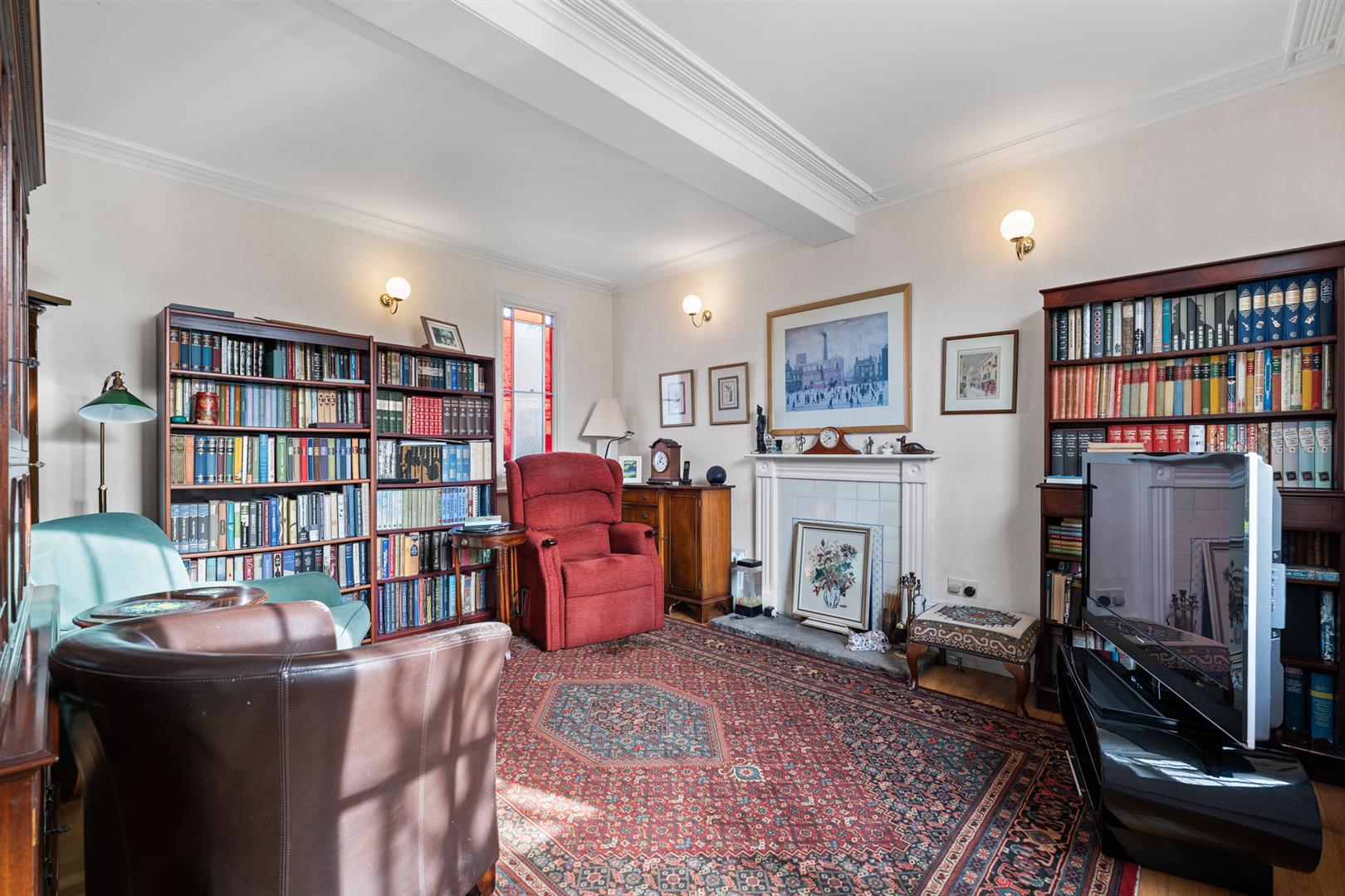 Sitting Room - 4.47m x 4.27m (14'8" x 14') - A further attractive, versatile, reception benefitting from a dual aspect with a double glazed sash window to the front and part stained glass window to the side. The focal point to the room is a chimney breast with slate hearth, inset electric flame coal effect fire, tiled surround and timber mantel (chimney has been capped). In addition the room having deep skirtings and a coved ceiling.
