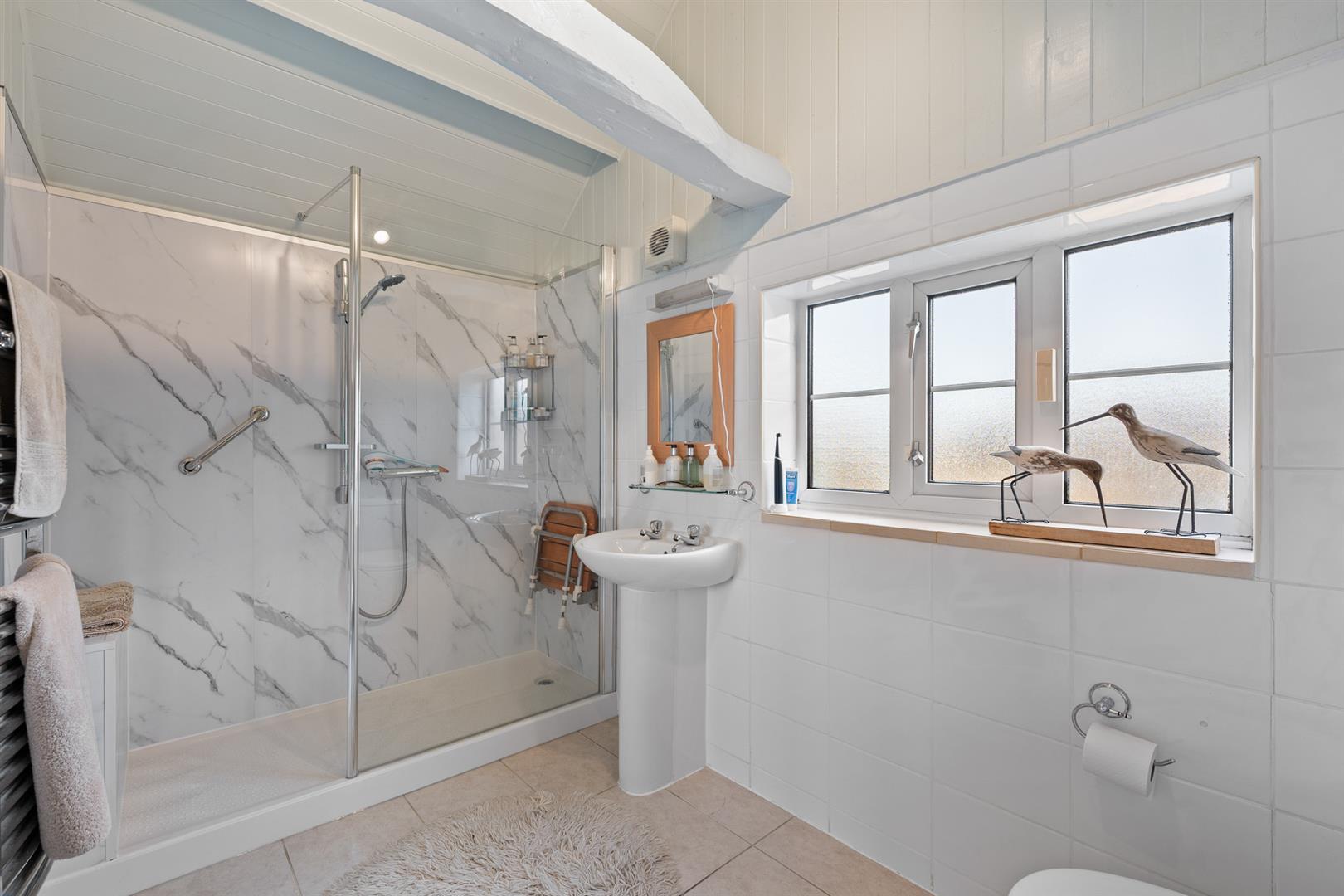 Shower Room - 3.18m x 1.75m (10'5" x 5'9") - Having a modern suite comprising double length shower enclosure with initial drying area, wall mounted shower mixer and glass screen, close coupled WC and pedestal washbasin; tiled splash backs and floor, contemporary towel radiator, attractive pitched ceiling with exposed purlins and central beam and double glazed window.