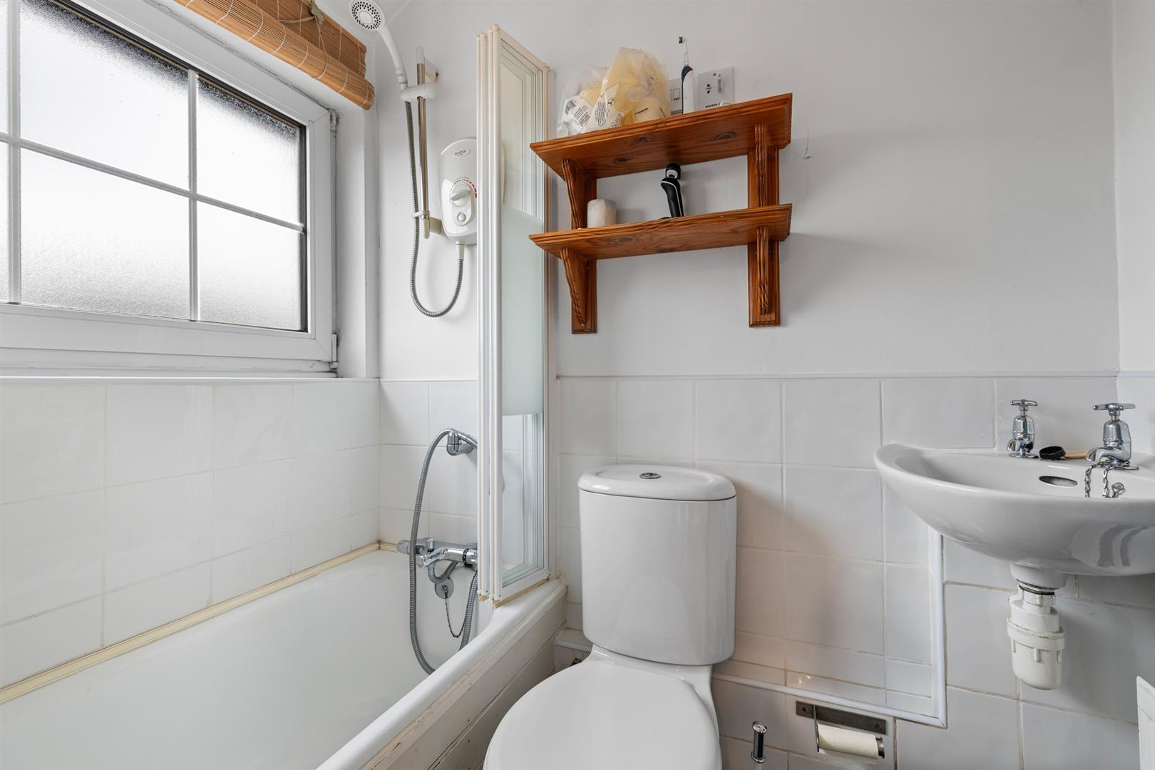 Ensuite Bathroom - 1.83m x 1.35m (6' x 4'5") - Having a suite comprising panelled bath with chrome mixer tap with integral shower handset and further wall mounted electric shower over, close coupled WC and washbasin; tiled splash backs and floor and double glazed window.