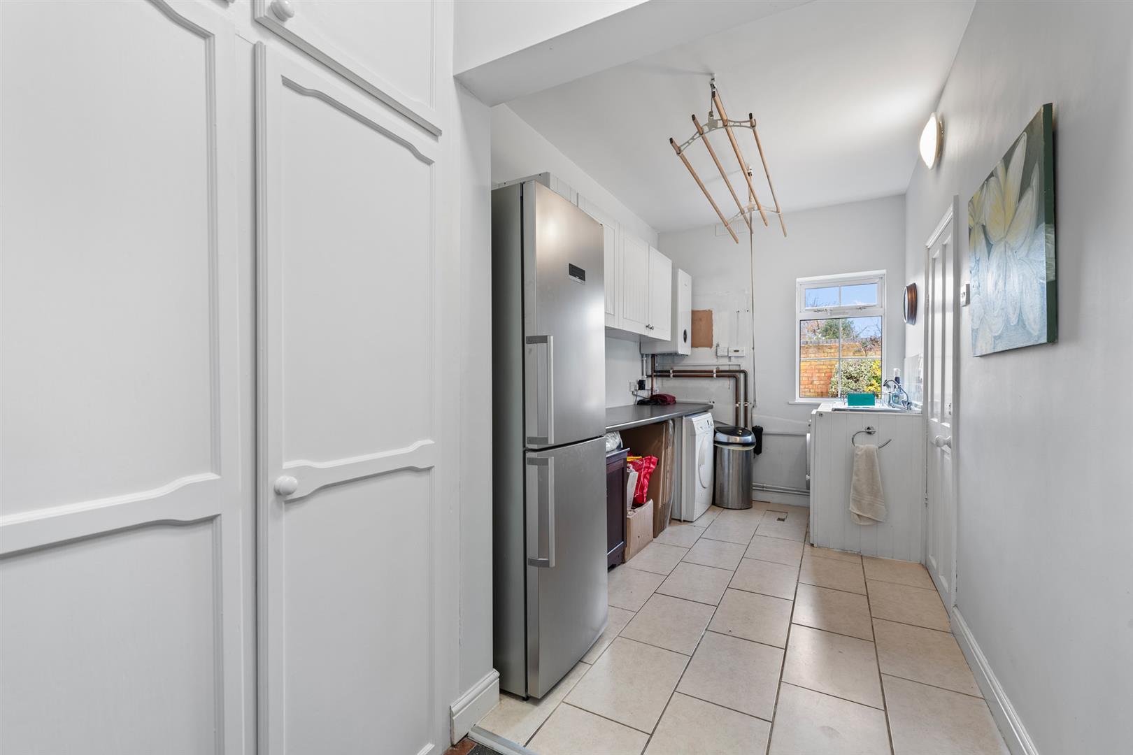 Pantry/Utility Cupboard - 1.45m x 0.97m (4'9" x 3'2") - Having integrated shelving, continuation of the quarry tiled floor and space for a fridge and freezer.