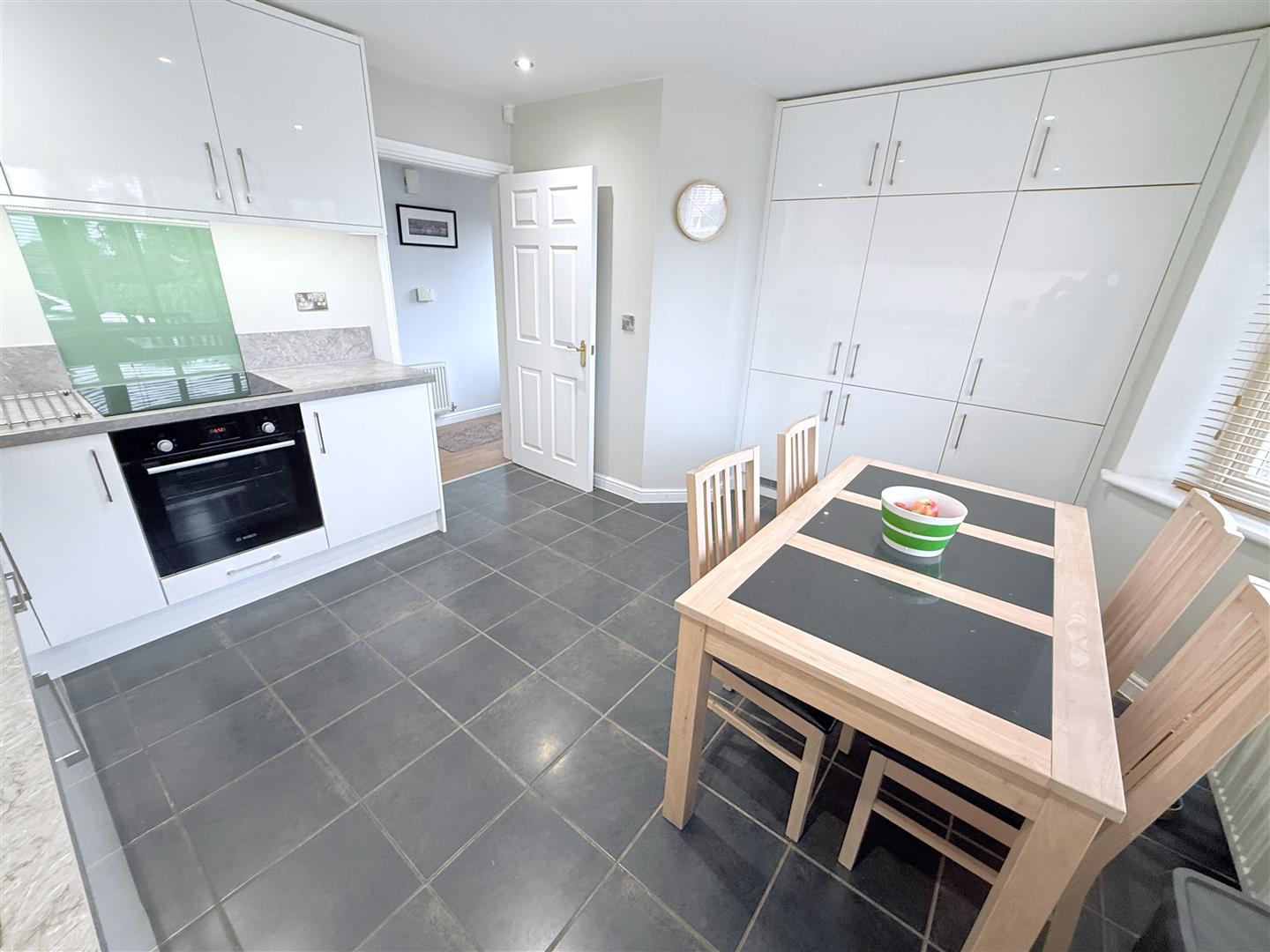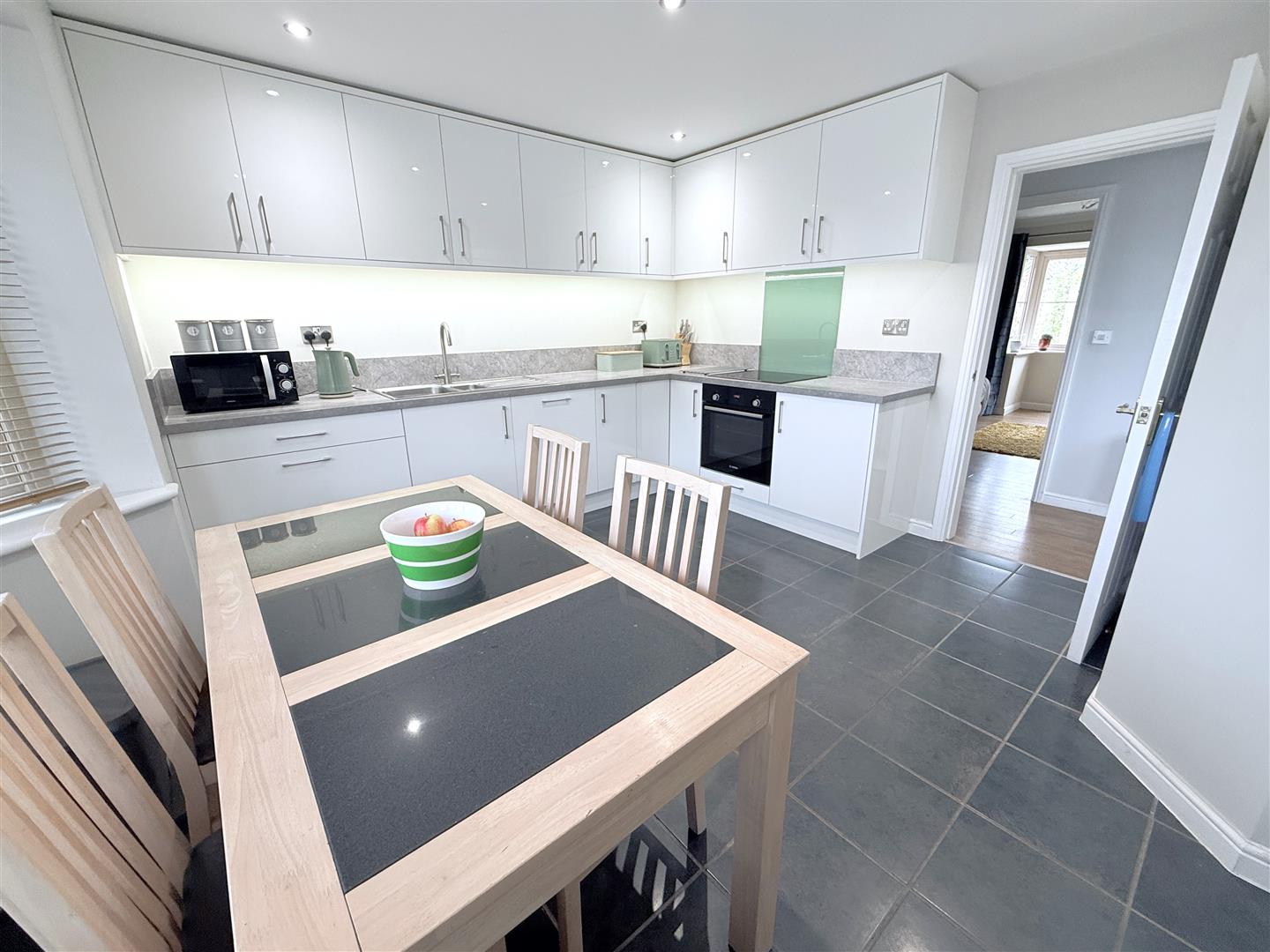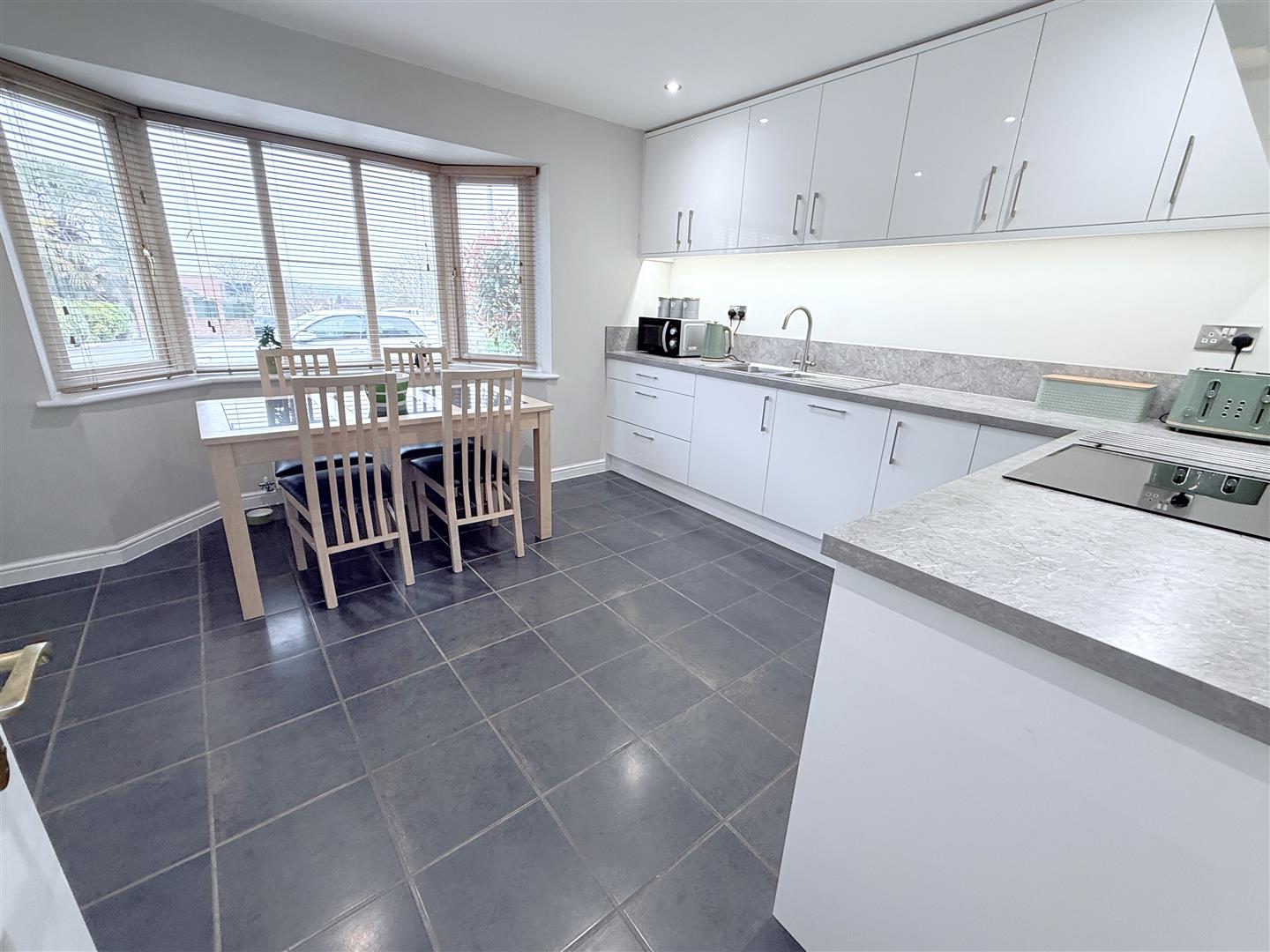 Dining Kitchen - 3.86m max into bay x 4.37m into cupboards (12'8" m - A well proportioned light and airy space having a large double glazed walk in bay window to the front with a pleasant aspect down to the close as well as having elevated views beyond. The kitchen has been tastefully upgraded with a generous range of contemporary gloss fronted wall, base and drawer units which provide an excellent level of storage including a full height pantry unit which also incorporates an integrated fridge freezer and washing machine; an L shaped configuration of laminate preparation surfaces with inset sink drain unit with brush metal swan neck mixer tap and additional integrated appliances including dishwasher, Bosch fan assisted oven and induction hob over; tiled floor, inset downlighters to the ceiling and ample room for a dining table.