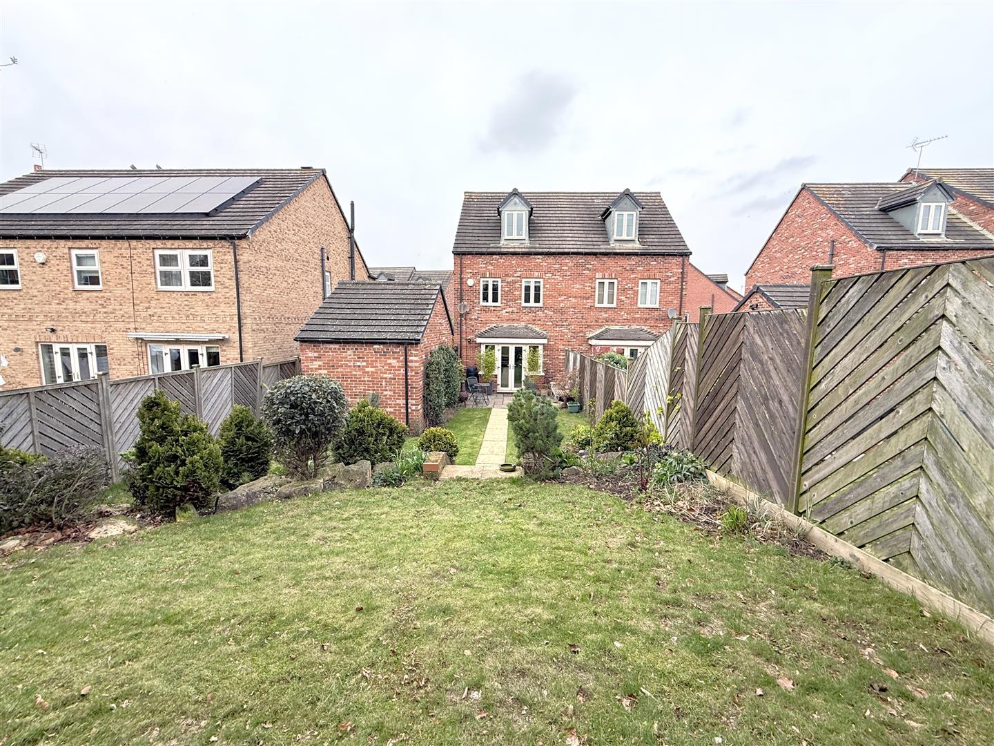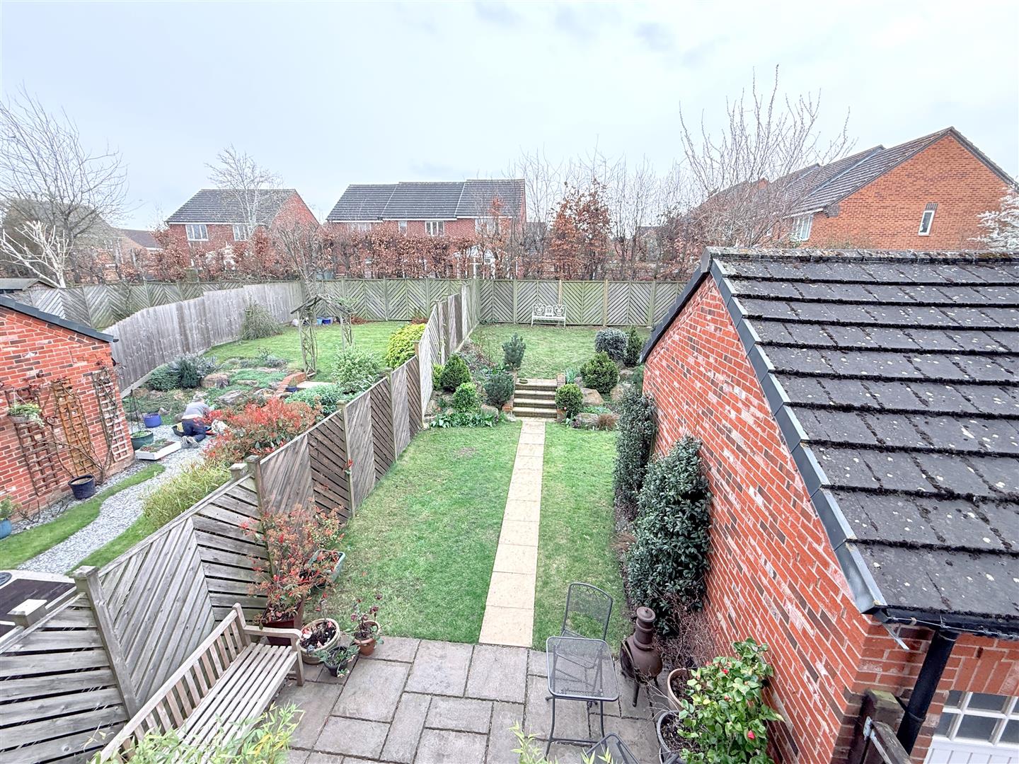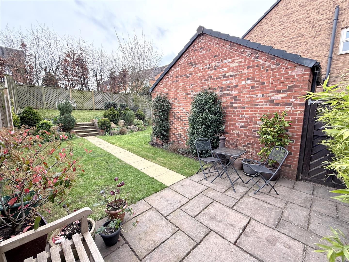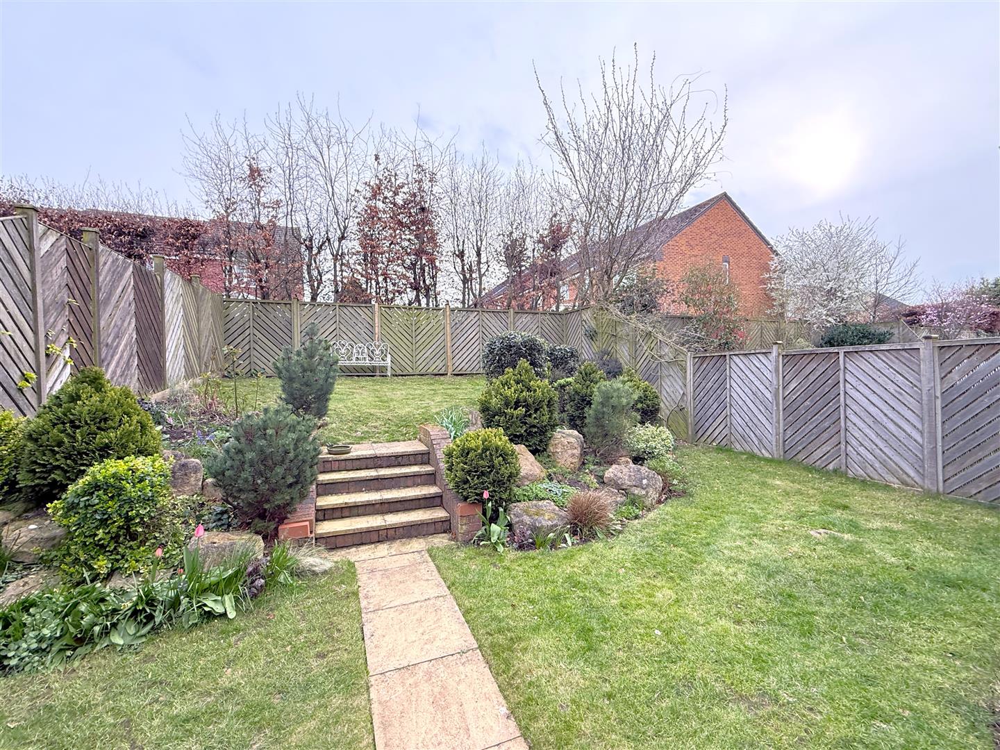 Exterior - The property occupies a favourable position at the head of the cul-de-sac with elevated views to the front. The property is set back behind a lawned frontage with established borders with inset shrubs. A driveway to the side of the property provides ample off road parking for two to three vehicles and, in turn, leads to a detached brick built garage at the rear with up and over door. A timber courtesy gate gives access into a southerly facing rear garden which is relatively generous by modern standards, having an initial paved terrace leading onto a central lawn bisected by a paved pathway with steps leading up to a further lawned area at the rear, all enclosed by contemporary fencing and having well stocked borders with established shrubs.