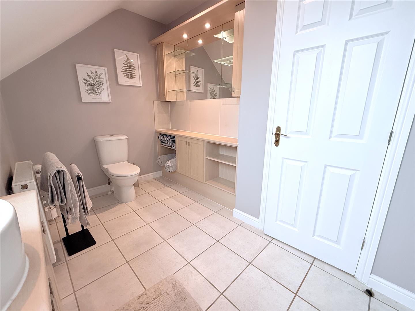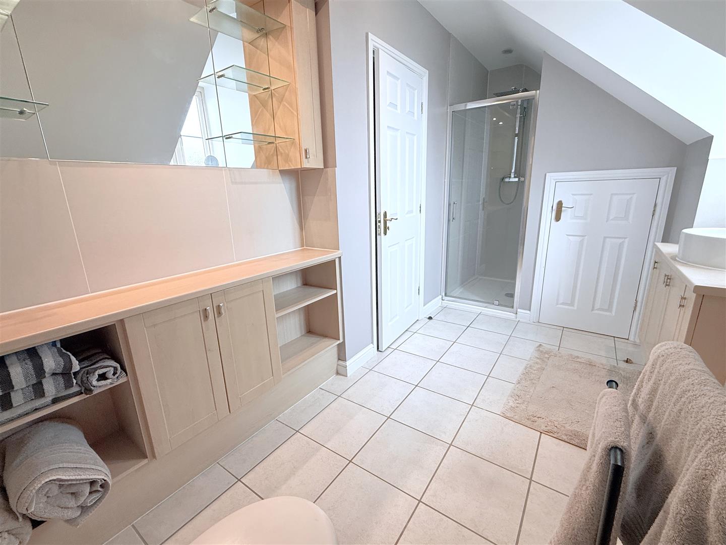 Ensuite Shower Room - 4.47m max x 1.93m (14'8" max x 6'4") - A well proportioned space having a three piece suite comprising shower enclosure with glass screen and wall mounted shower mixer with both independent handset and rainwater rose over, close coupled WC and vanity unit with round bowl washbasin with chrome mixer tap and tiled splash backs; further integrated vanity area providing a low level drawer and shelving unit, further wall mounted storage cupboards over with central mirrored alcove and inset downlighters; access to under eaves storage, shaver point and double glazed dormer window.