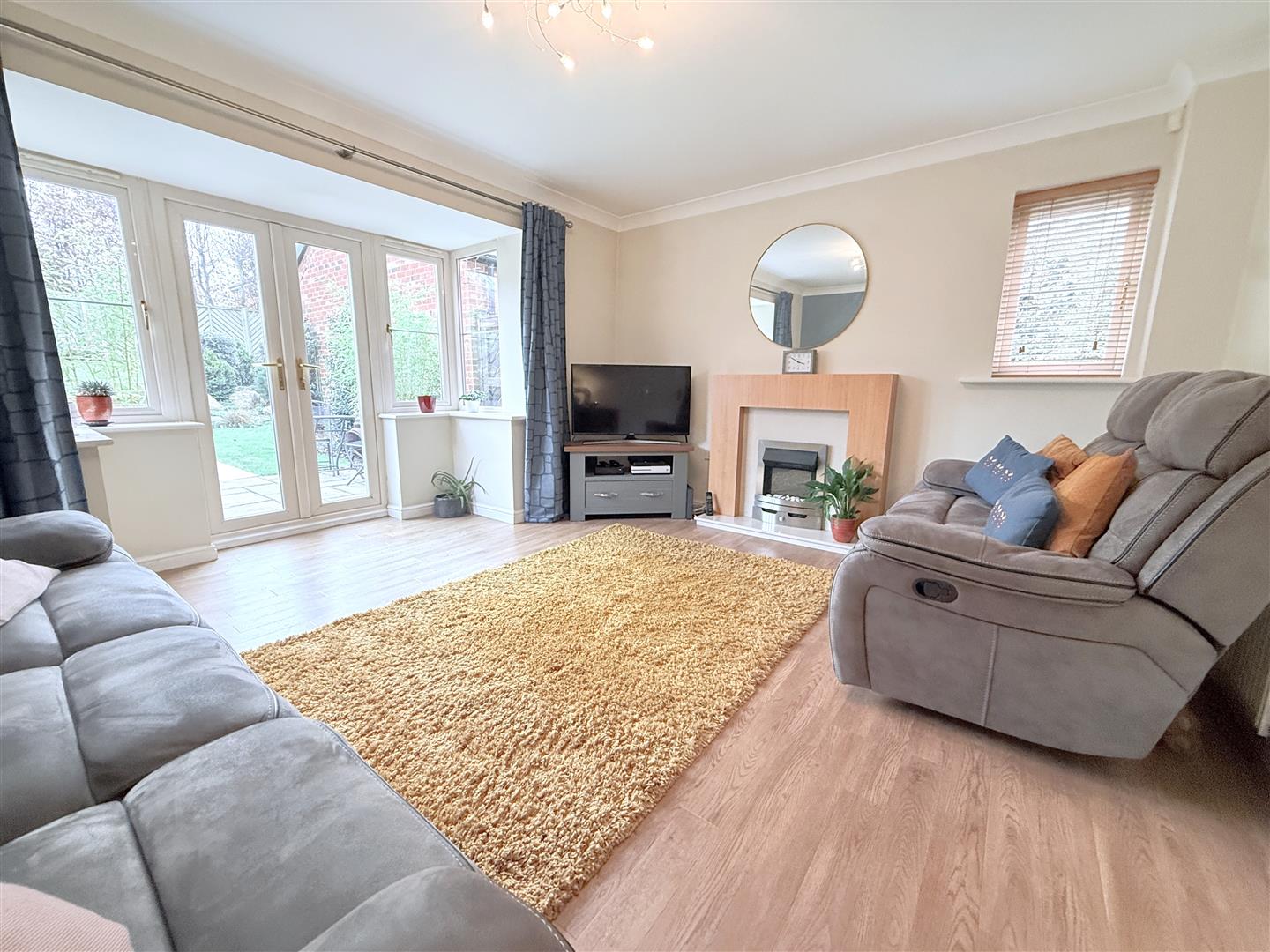 Sitting Room - 4.39m into bay x 4.45m (14'5" into bay x 14'7") - A well proportioned light and airy space benefitting from a southerly aspect to the rear with a large walk in box bay with double glazed French doors leading out into the rear garden. The focal point to the room is a feature fire surround, mantel and hearth with inset electric pebble effect fire; in addition continuation of the oak effect flooring, coved ceiling and useful under stairs alcove.