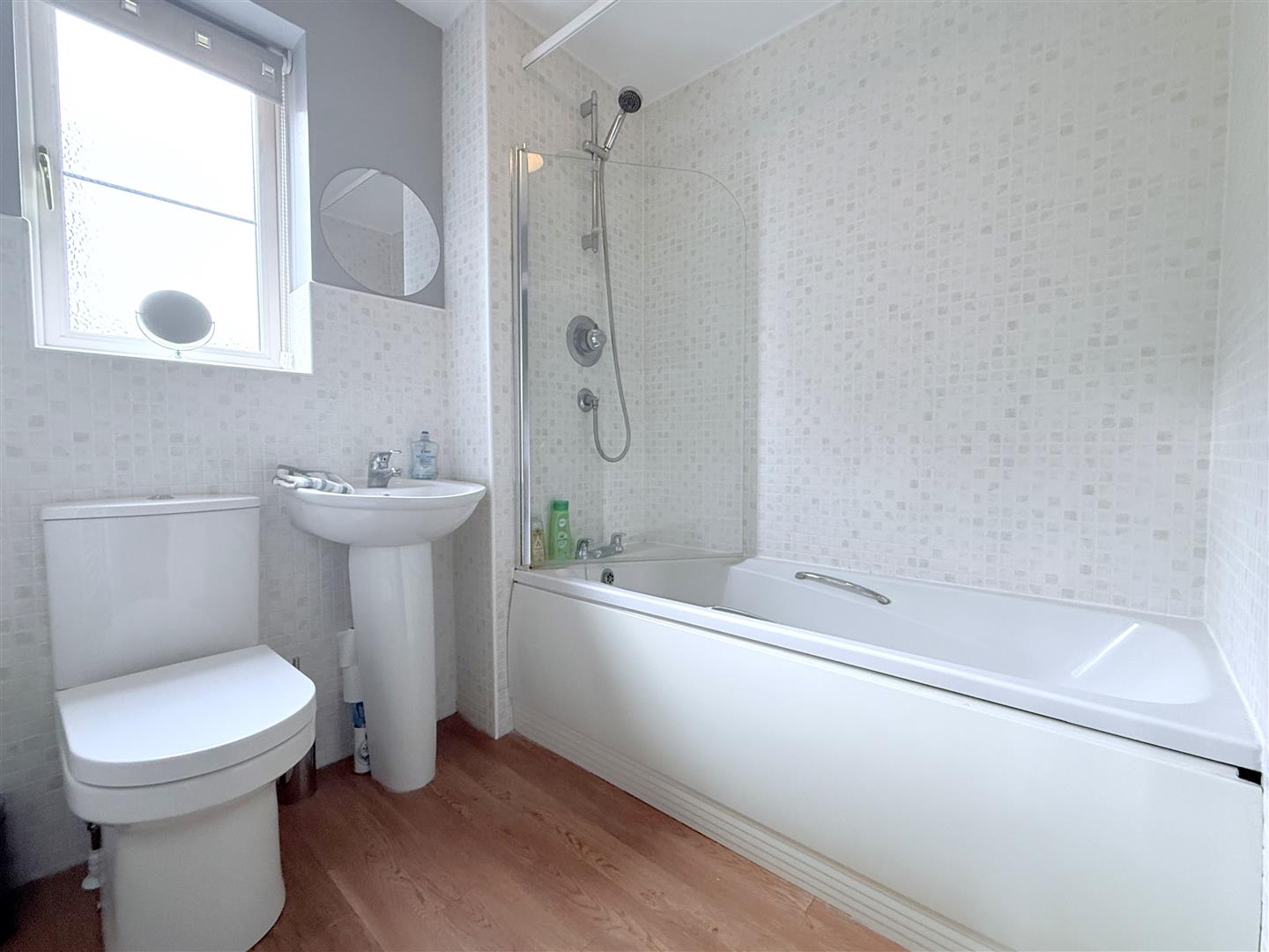 First Floor Bathroom - 2.01m x 1.91m (6'7" x 6'3") - Having a three piece white suite comprising panelled bath with chrome mixer tap, additional wall mounted shower mixer and glass screen, close coupled WC and pedestal washbasin with chrome mixer tap and mosaic effect tiled splash backs; oak effect flooring, contemporary towel radiator, shaver point and double glazed window.