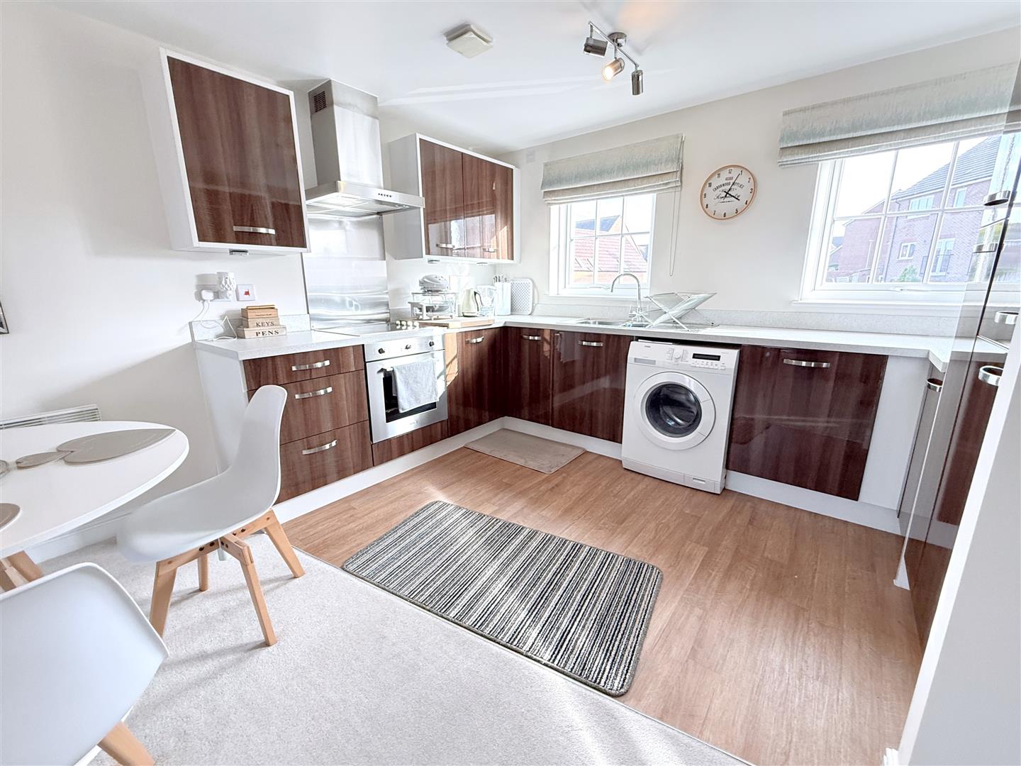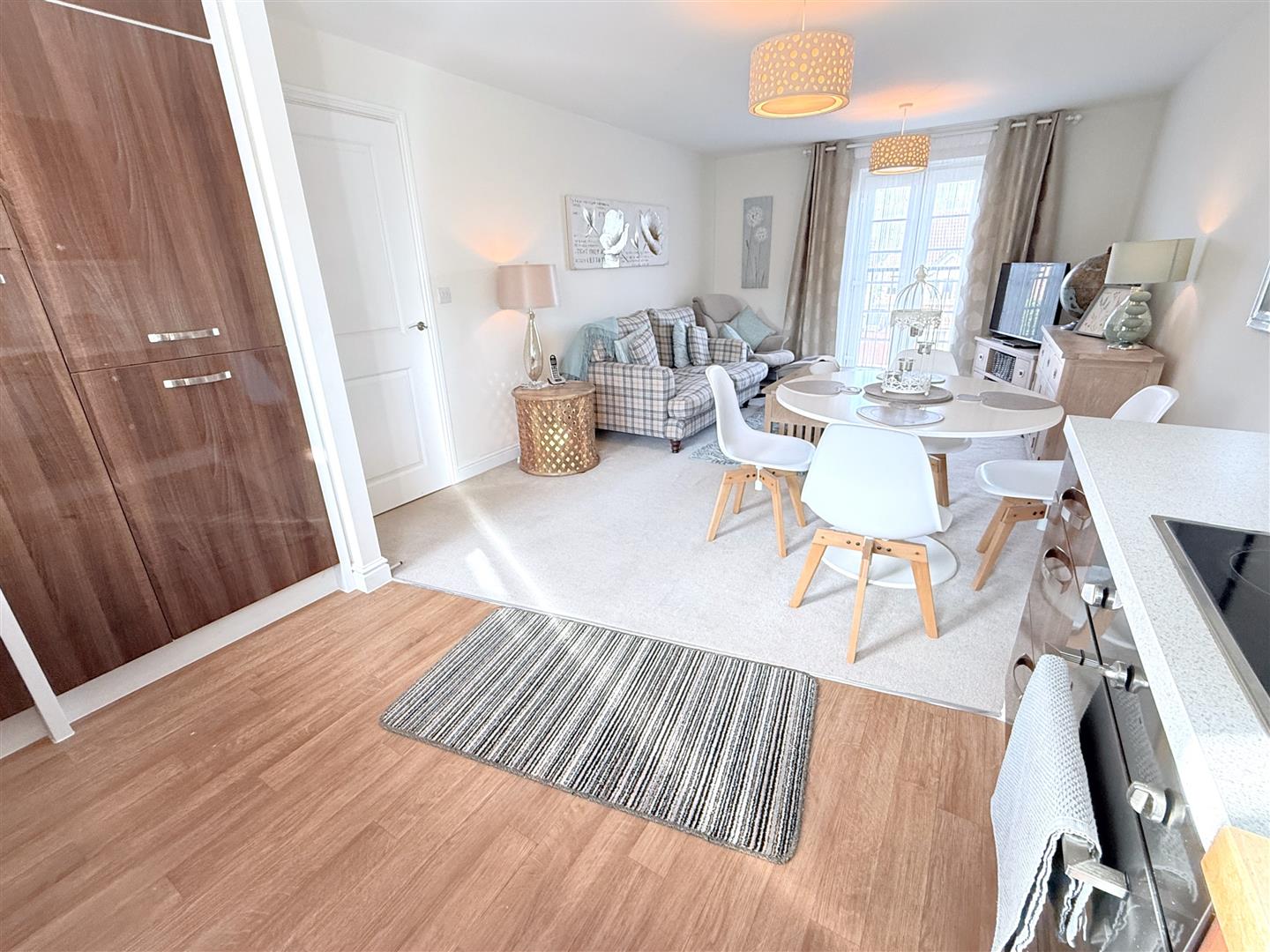 Open Plan Living/Dining Room - 6.96m x 3.58m (22'10" x 11'9") - A fantastic, well proportioned, open plan, light and airy space which benefits from a dual aspect, having double glazed window to the rear and French doors with Juliet balcony to the front. This well proportioned space is perfect for everyday living and entertaining, comprising an initial reception area large enough to accommodate both a living and dining space and is open plan to a tastefully appointed contemporary kitchen fitted with a generous range of integrated units with gloss door fronts, having a U shaped configuration of preparation surfaces with inset sink and drain unit with chrome swan neck mixer tap, integrated appliances including single fan assisted oven, electric hob over with contemporary chimney hood fridge freezer and dishwasher, space for washing machine and pull out larder unit.