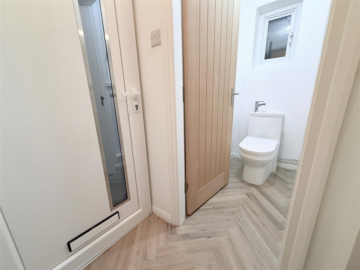 Ground Floor Cloakroom - 1.52m x 0.99m (5'0 x 3'3) - Having contemporary WC with integrated wash basin, contemporary towel radiator, double glazed window to the side.