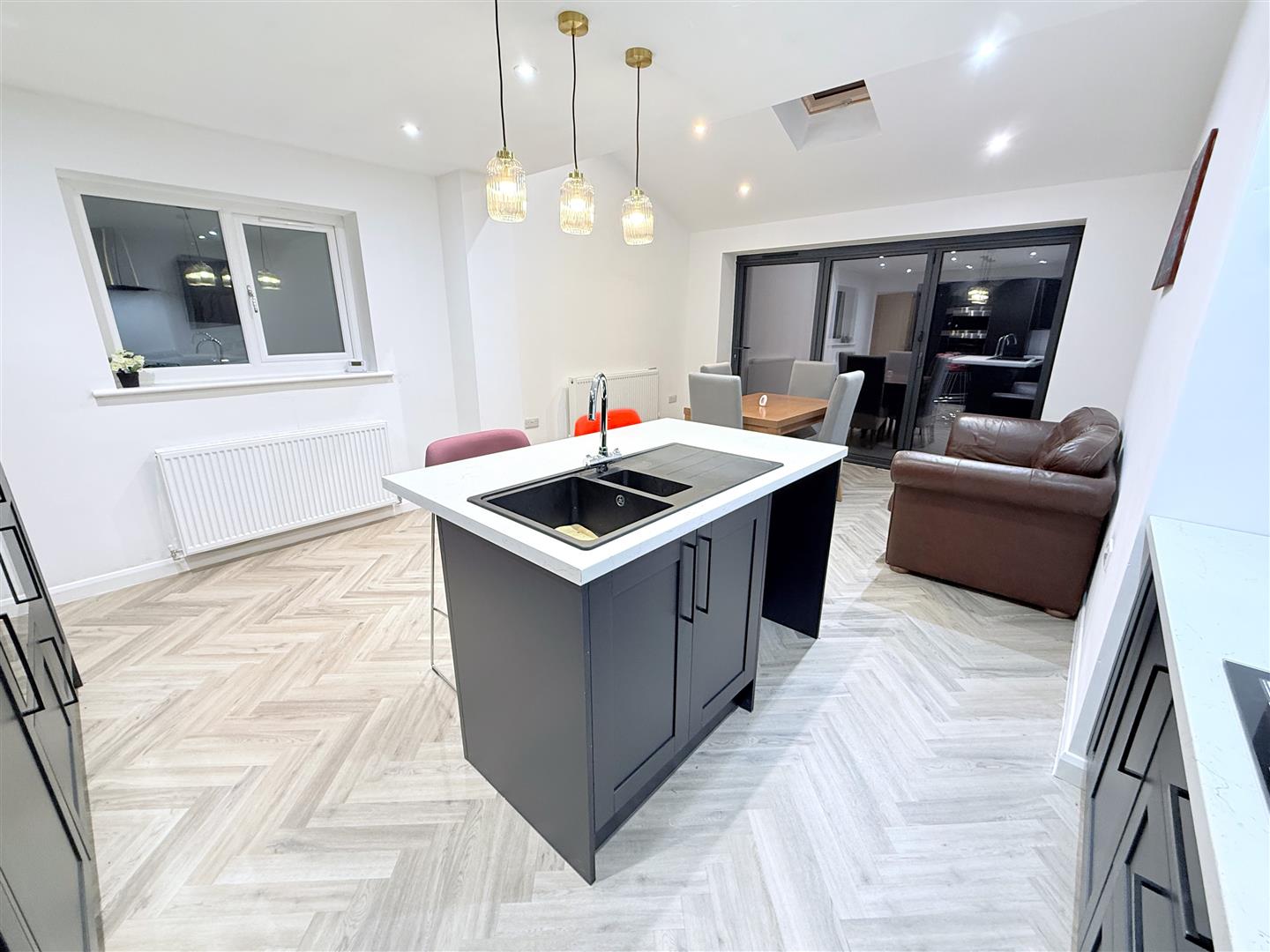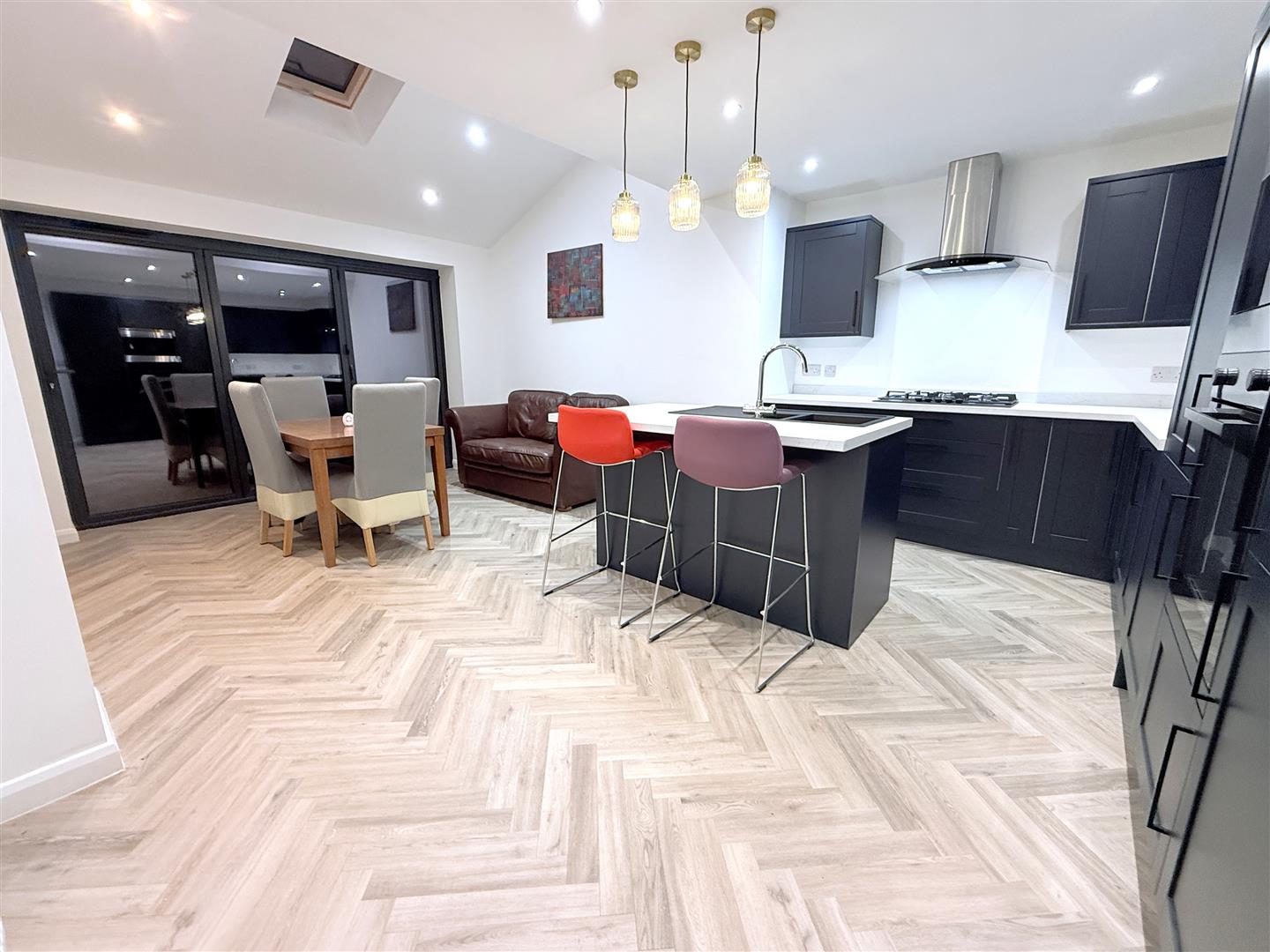 Living/Dining Kitchen - 5.79m x 3.89m (4.52m max) (19'0 x 12'9 (14'10 max) - A fantastic well proportioned space which has been extended with an attractive pitched roof addition, inset skylight to the ceiling, run of bi-fold doors leading out into the rear garden. This area is large enough to accommodate both living and dining space and likely to become the hub of the home, perfect for everyday living and entertaining.