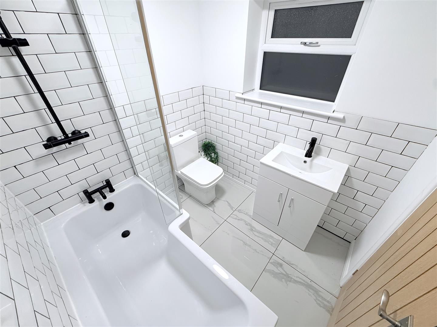 Bathroom - 2.01m x 1.91m (6'7 x 6'3) - Having a contemporary suite comprising P-shaped shower bath with glass screen, wall-mounted shower mixer with rose over, close coupled WC, vanity unit with inset wash basin, contemporary towel radiator, double glazed window to the side.