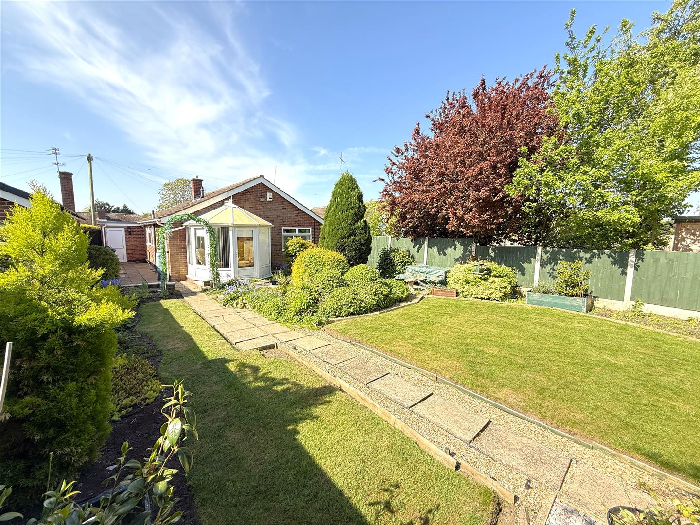 The bungalow occupies a relatively level, established plot which is generous by modern standards. The property is set well back behind an open plan frontage with driveway and garage and, to the rear, a pleasant enclosed garden which offers a good degree of privacy and is well stocked with an abundance of trees and shrubs.