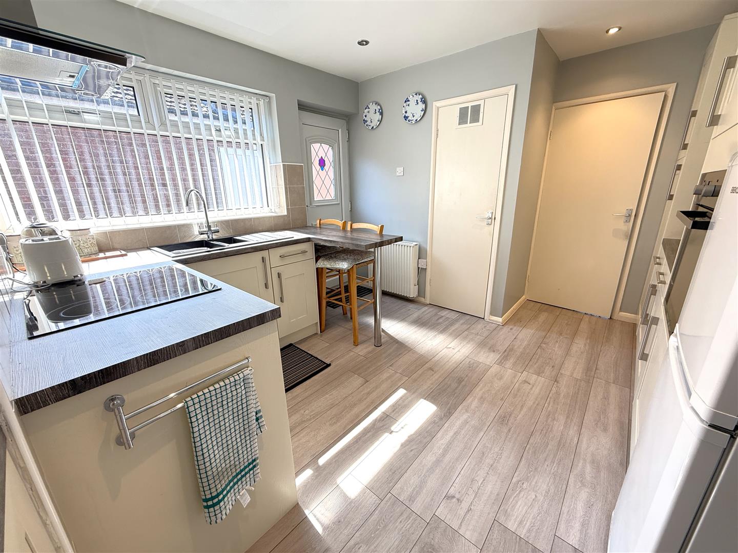 Kitchen - 3.76m x 3.30m max (12'4" x 10'10" max) - A well proportioned space having aspect to the side and which has been tastefully modernised with a generous range of Shaker style wall, base and drawer units with cream door fronts and brush metal fittings, having two runs of laminate preparation surfaces including integral breakfast bar, sink and drain unit with chrome mixer tap, integrated appliances including Hotpoint ceramic hob with chimney hood over and Zanussi fan assisted oven, space for free standing fridge freezer, electric heater, walk in pantry, double glazed exterior door and further glazed doorway leading through into: