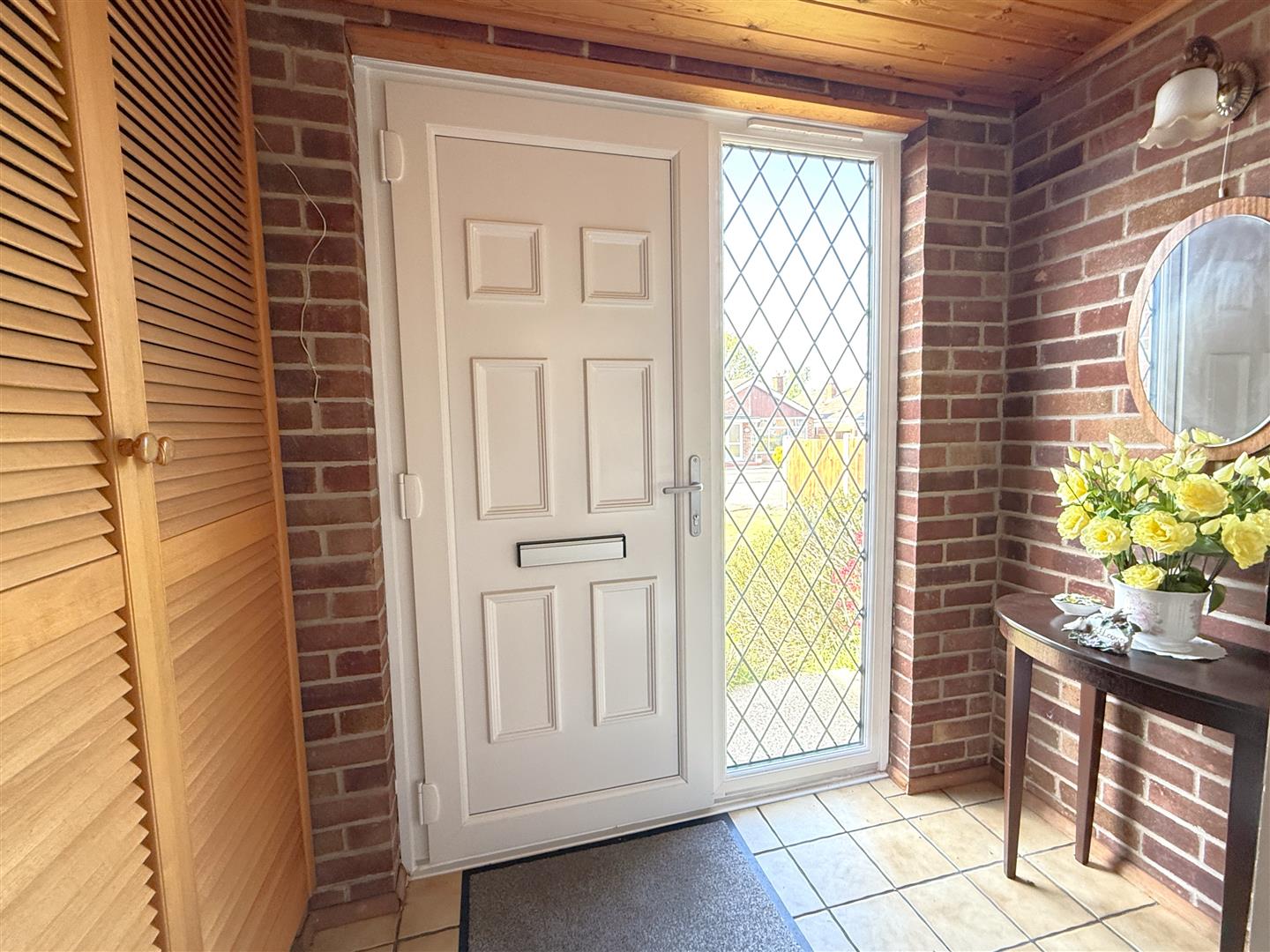 Initial Enclosed Porch - 2.69m into cloaks cupboard x 1.22m (8'10" into clo - A useful enclosed storm porch having built in cloaks cupboard with hanging rail, tiled floor and further glazed internal door leading through into: