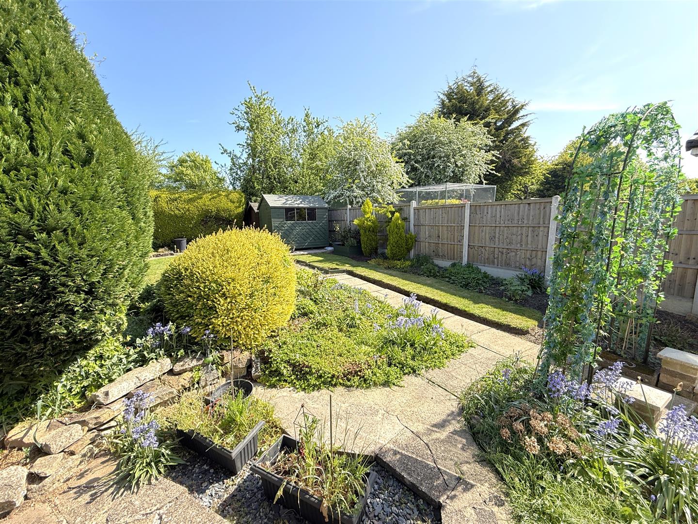 Exterior - The property occupies a pleasant position within this well regarded, established area of the village, surrounded by similar dwellings and set back behind an open plan frontage which is mainly laid to lawn and enclosed to the side by hedging and panelled fencing. A driveway provides off road car standing and, in turn, leads to an attached garage with up an over door. The remainder of the garden is given over to established borders well stocked with a range of shrubs. A gateway to the side gives access into the rear garden which is an attractive feature of the property being generous by modern standards, offering a good degree of privacy having initial paved seating area leading out onto a central lawn, well stocked borders with a range of established trees and shrubs and two useful timber storage sheds all enclosed by hedging and fencing.