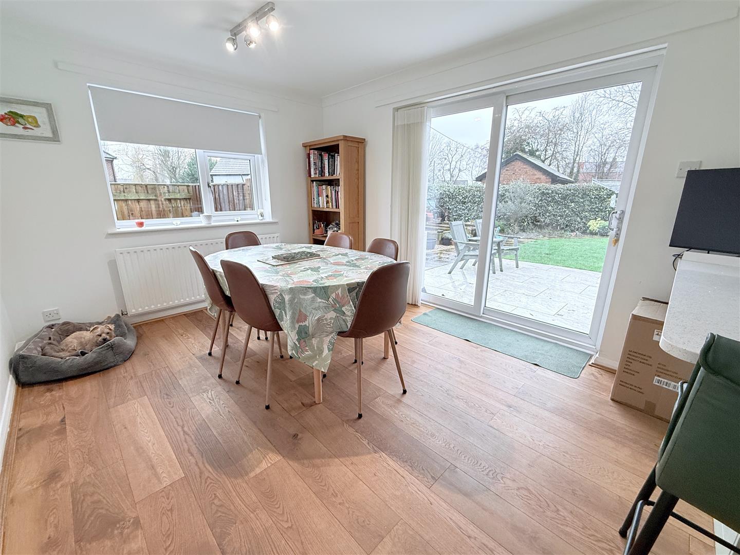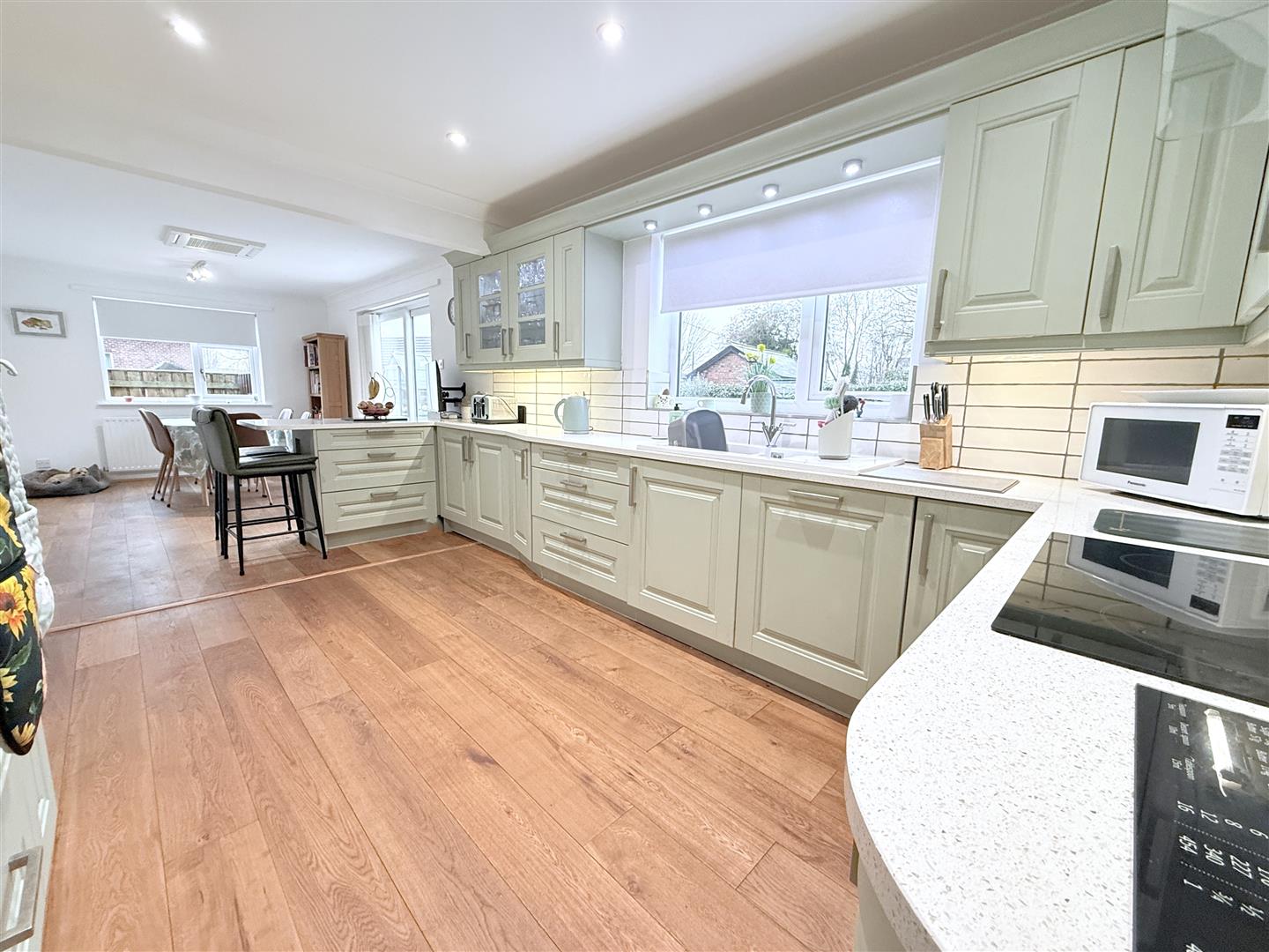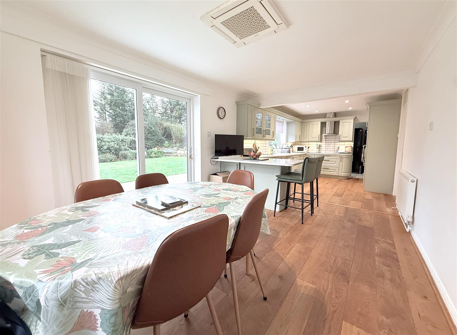 Open Plan Dining Kitchen - 8.53m x 3.05m (28' x 10') - A particularly well proportioned open plan everyday living/entertaining space, flooded with light benefitting from windows to two elevations including sliding double glazed patio doors leading out into the rear garden. The initial kitchen area is tastefully appointed with a generous range of wall, base and drawer units with hand painted door fronts finished in heritage style colours with a generous run of quartz preparation surfaces including integral breakfast bar providing informal dining. In addition; inset ceramic sink and drain unit with chrome swan neck mixer tap and tiled splash backs; under unit lighting; integrated appliances including Bosch induction hob, Bosch double oven set in a larder surround and dishwasher; inset downlighters to the ceiling, continuation of the engineered oak flooring, built in air conditioning unit providing both warm and cool air to the dining area and a further door leading through into: