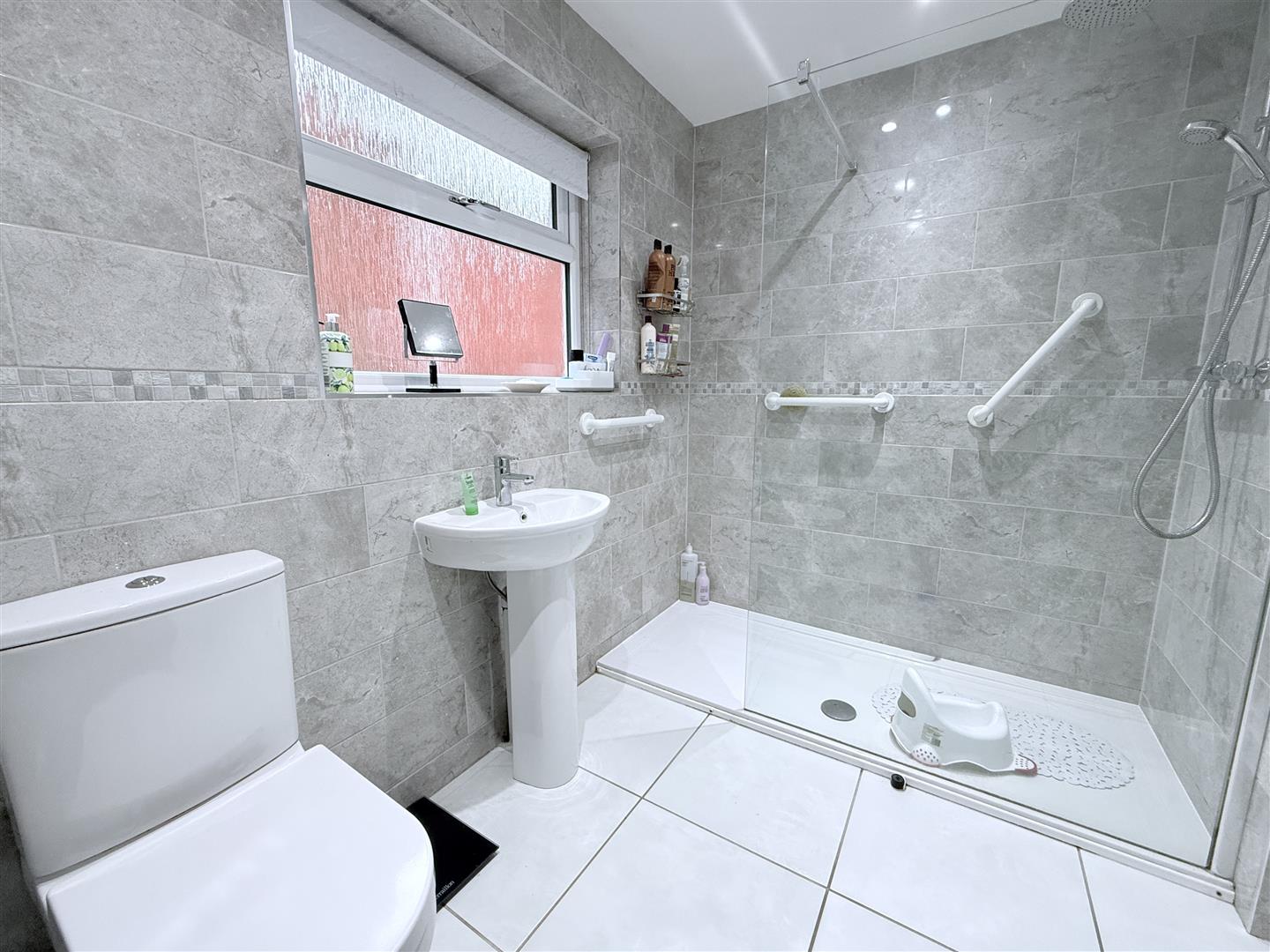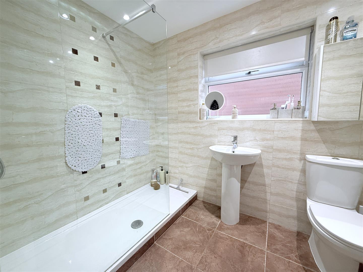 Ensuite Shower Room - 2.72m x 1.80m (8'11" x 5'11") - Having a contemporary suite comprising large double width shower enclosure with glass screen and wall mounted shower mixer with both independent handset and rainwater rose over, close coupled WC and pedestal washbasin; fully tiled walls, contemporary towel radiator, shelved storage cupboard and double glazed window to the side.