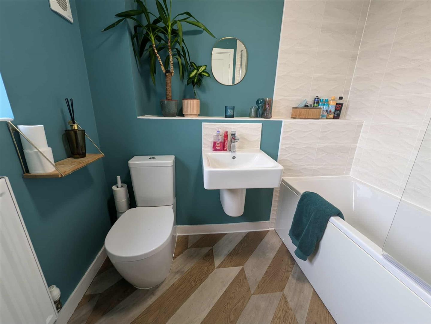 Bathroom - 2.18m x 1.91m (7'2" x 6'3") - Having a contemporary suite comprising panelled bath with chrome mixer tap and wall mounted shower over, close coupled WC and half pedestal washbasin with chrome mixer tap and tiled splash backs, central heating radiator and double glazed window to the rear.