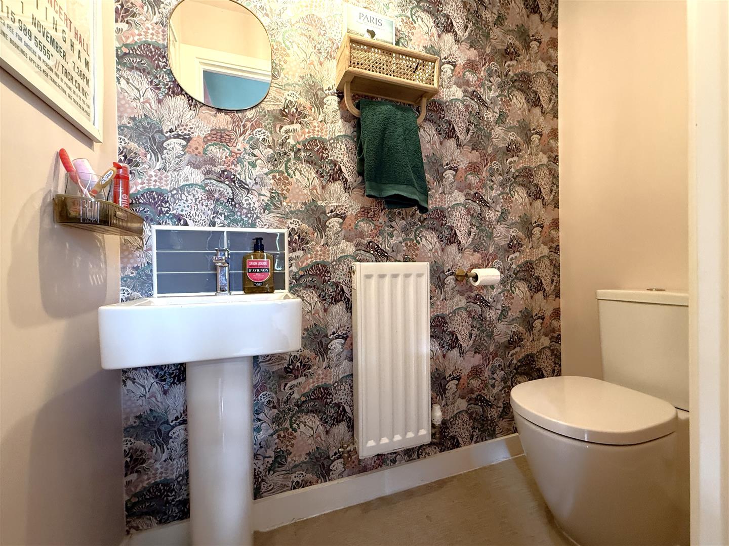 Ground Floor Cloak Room - 1.80m x 0.84m (5'11" x 2'9") - Having a two piece contemporary suite comprising close coupled WC and pedestal washbasin with chrome mixer tap and tiled splash backs and central heating radiator.