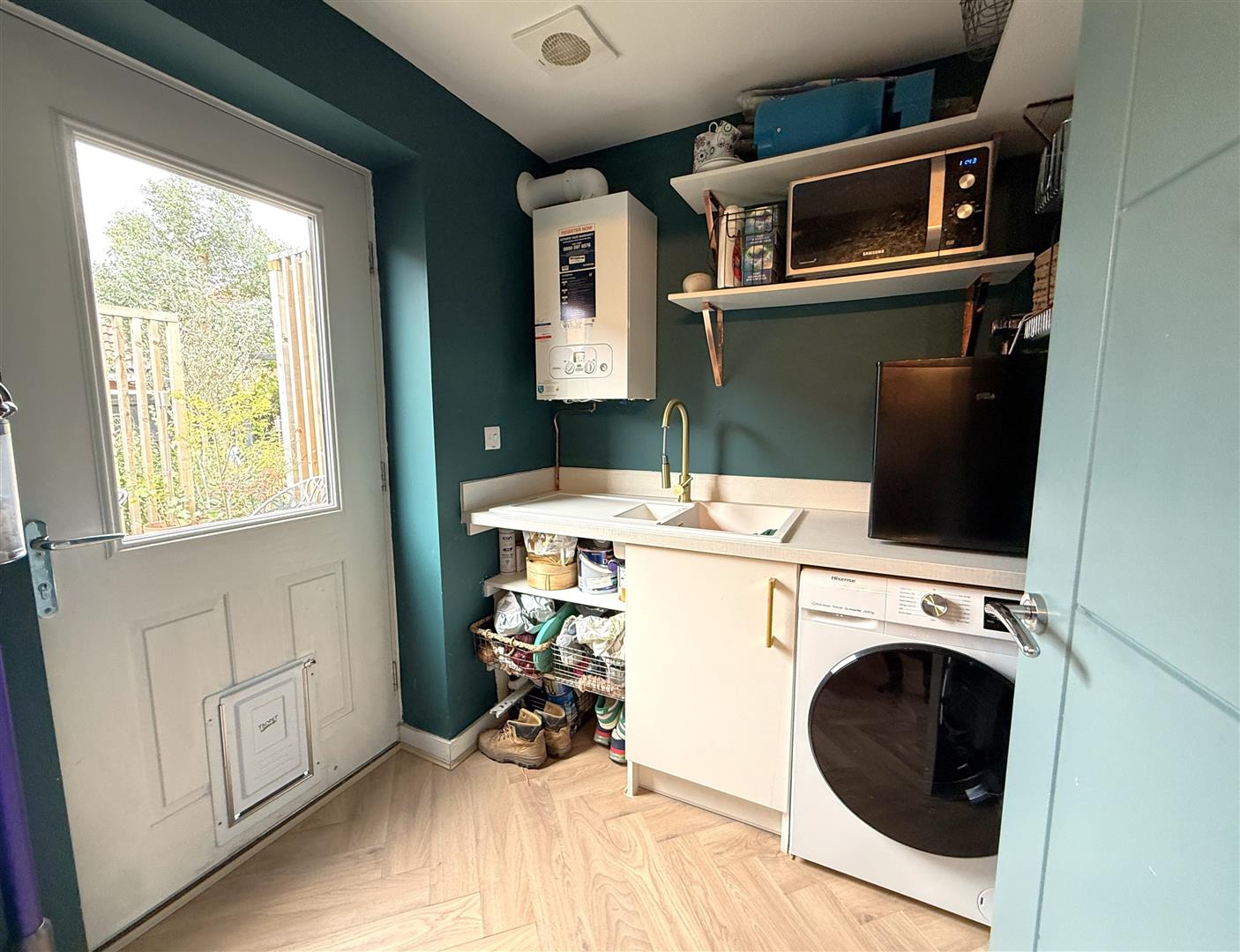 Utility Room - 1.78m x 1.93m (5'10" x 6'4") - Having a fitted base unit with work surface over, inset sink and drain unit with articulated mixer tap, plumbing for washing machine, space for further free standing appliance, wall mounted gas central heating boiler and double glazed exterior door into the garden.